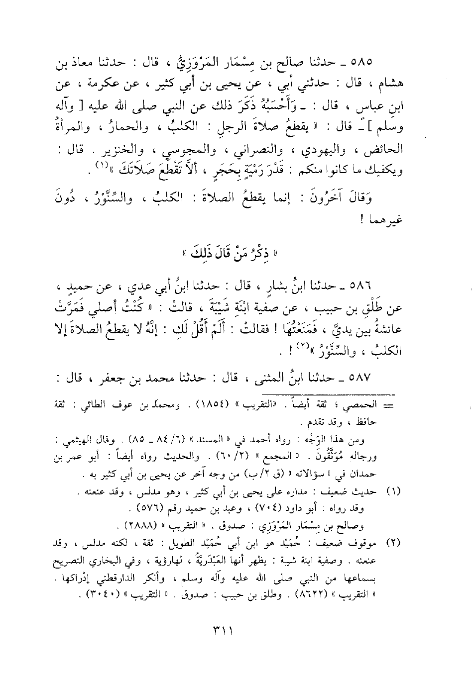 585 - حَدثنَا صَالح بن مِسْمَار الْمروزِي، قَالَ: حَدثنَا معَاذ بن هِشَام، قَالَ: حَدثنِي أبي، عَن يحيى بن أبي كثير، عَن عِكْرِمَة، عَن ابْن عَبَّاس، قَالَ: - وَأَحْسبهُ ذكر ذَلِك عَن النَّبِي - صَلَّى اللَّهُ عَلَيْهِ وَسَلَّم َ - قَالَ: " يقطع صَلَاة الرجل: الْكَلْب، وَالْحمار، وَالْمَرْأَة الْحَائِض، واليهودي، وَالنَّصْرَانِيّ، والمجوسي، وَالْخِنْزِير. قَالَ: وَيَكْفِيك مَا كَانُوا مِنْكُم: قدر رمية بِحجر، أَلا تقطع صَلَاتك ".