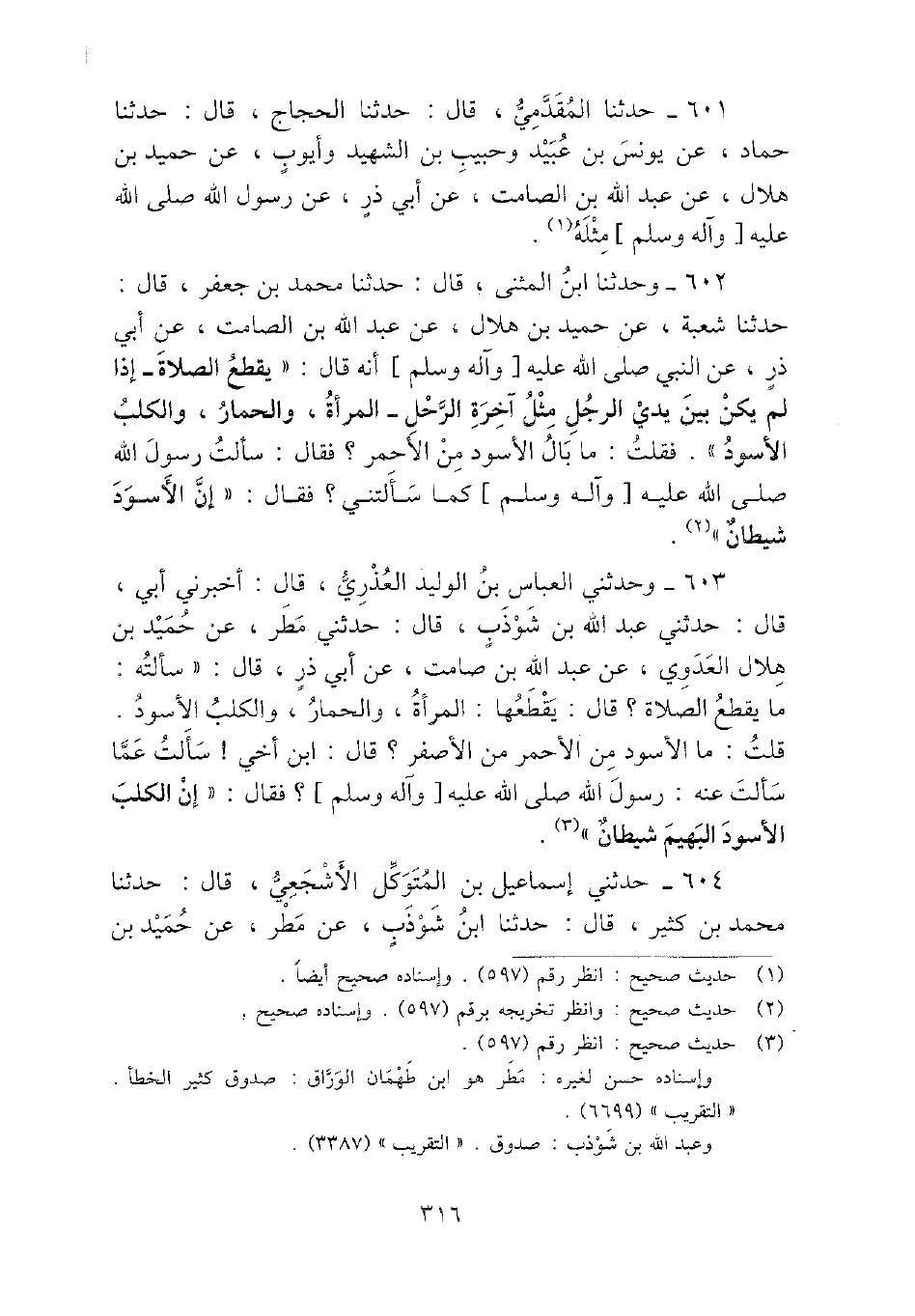 603 - وحَدثني الْعَبَّاس بن الْوَلِيد العذري، قَالَ: أَخْبرنِي أبي، قَالَ: حَدثنِي عبد الله بن شَوْذَب، قَالَ: حَدثنِي مطر، عَن حميد بن هِلَال الْعَدوي، عَن عبد الله بن صَامت، عَن أبي ذَر، قَالَ: " سَأَلته: مَا يقطع الصَّلَاة؟ قَالَ: يقطعهَا: الْمَرْأَة، وَالْحمار، وَالْكَلب الْأسود. قلت: مَا الْأسود من الْأَحْمَر من الْأَصْفَر؟ قَالَ: ابْن أخي! سَأَلت عَمَّا سَأَلت عَنهُ: رَسُول الله - صَلَّى اللَّهُ عَلَيْهِ وَسَلَّم َ -؟ فَقَالَ: " إِن الْكَلْب الْأسود البهيم شَيْطَان ".