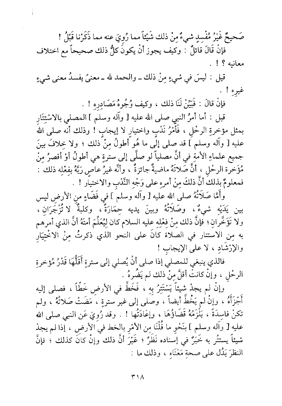 وَأما صلَاته - صَلَّى اللَّهُ عَلَيْهِ وَسَلَّم َ - فِي فضاء من الأَرْض لَيْسَ بَين يَدَيْهِ شَيْء، وَصلَاته وَبَين يَدَيْهِ حمارة، وكلبة لَا تزجران، وَلَا تؤخران؛ فَإِن ذَلِك من فعله عَلَيْهِ السَّلَام كَانَ ليعلم أمته أَن الَّذِي أَمرهم بِهِ من الاستتار فِي الصَّلَاة كَانَ على النَّحْو الَّذِي ذكرت من الِاخْتِيَار والإرشاد، لَا على الْإِيجَاب {