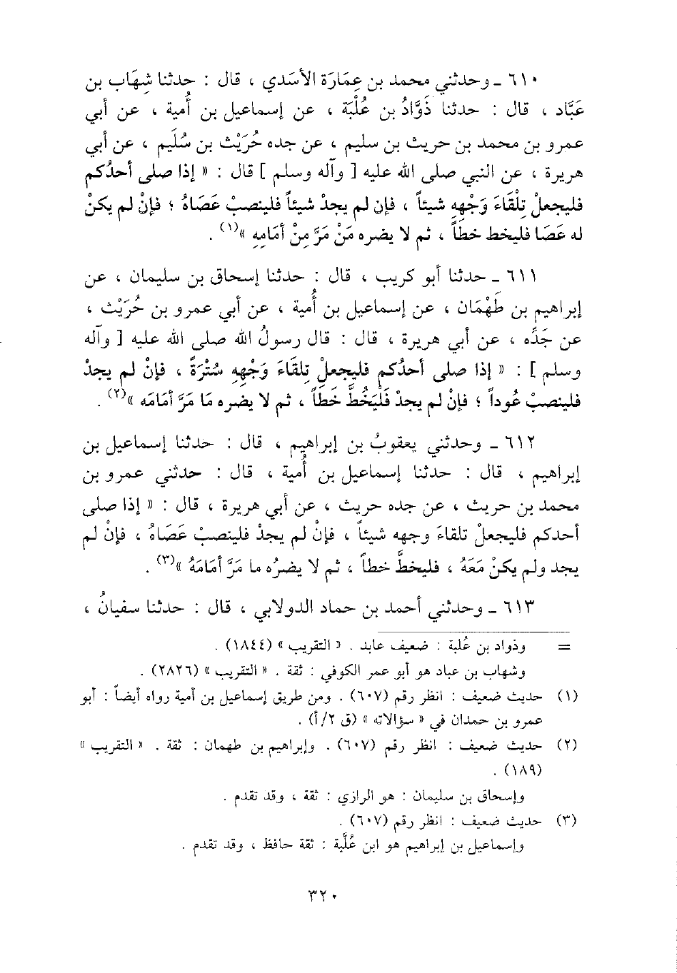 612 - وحَدثني يَعْقُوب بن إِبْرَاهِيم، قَالَ: حَدثنَا إِسْمَاعِيل بن إِبْرَاهِيم، قَالَ: حَدثنَا إِسْمَاعِيل بن أُميَّة، قَالَ: حَدثنِي عَمْرو بن مُحَمَّد بن حُرَيْث، عَن جده حُرَيْث، عَن أبي هُرَيْرَة، قَالَ: " إِذا صلى أحدكُم فليجعل تِلْقَاء وَجهه شَيْئا، فَإِن لم يجد فلينصب عَصَاهُ، فَإِن لم يجد وَلم يكن مَعَه، فليخط خطا، ثمَّ لَا يضرّهُ مَا مر أَمَامه ".