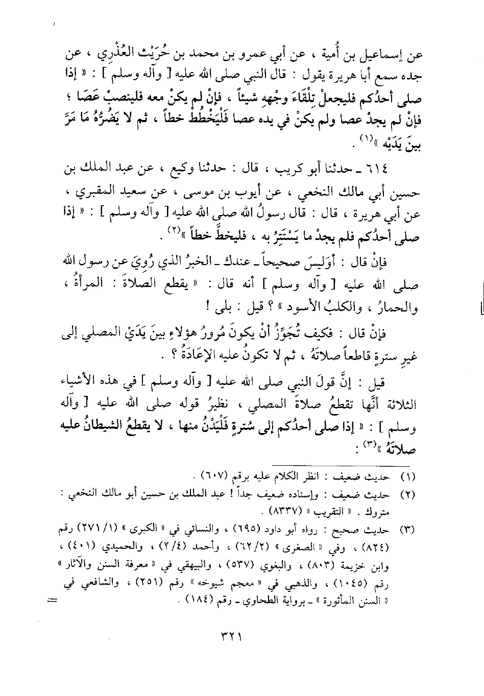 عَن إِسْمَاعِيل بن أُميَّة، عَن أبي عَمْرو بن مُحَمَّد بن حُرَيْث العذري، عَن جده سمع أَبَا هُرَيْرَة يَقُول: قَالَ النَّبِي - صَلَّى اللَّهُ عَلَيْهِ وَسَلَّم َ -: " إِذا صلى أحدكُم فليجعل تِلْقَاء وَجهه شَيْئا، فَإِن لم يكن مَعَه فلينصب عَصا؛ فَإِن لم يجد عَصا وَلم يكن فِي يَده عَصا فليخطط خطا، ثمَّ لَا يضرّهُ مَا مر بَين يَدَيْهِ ".