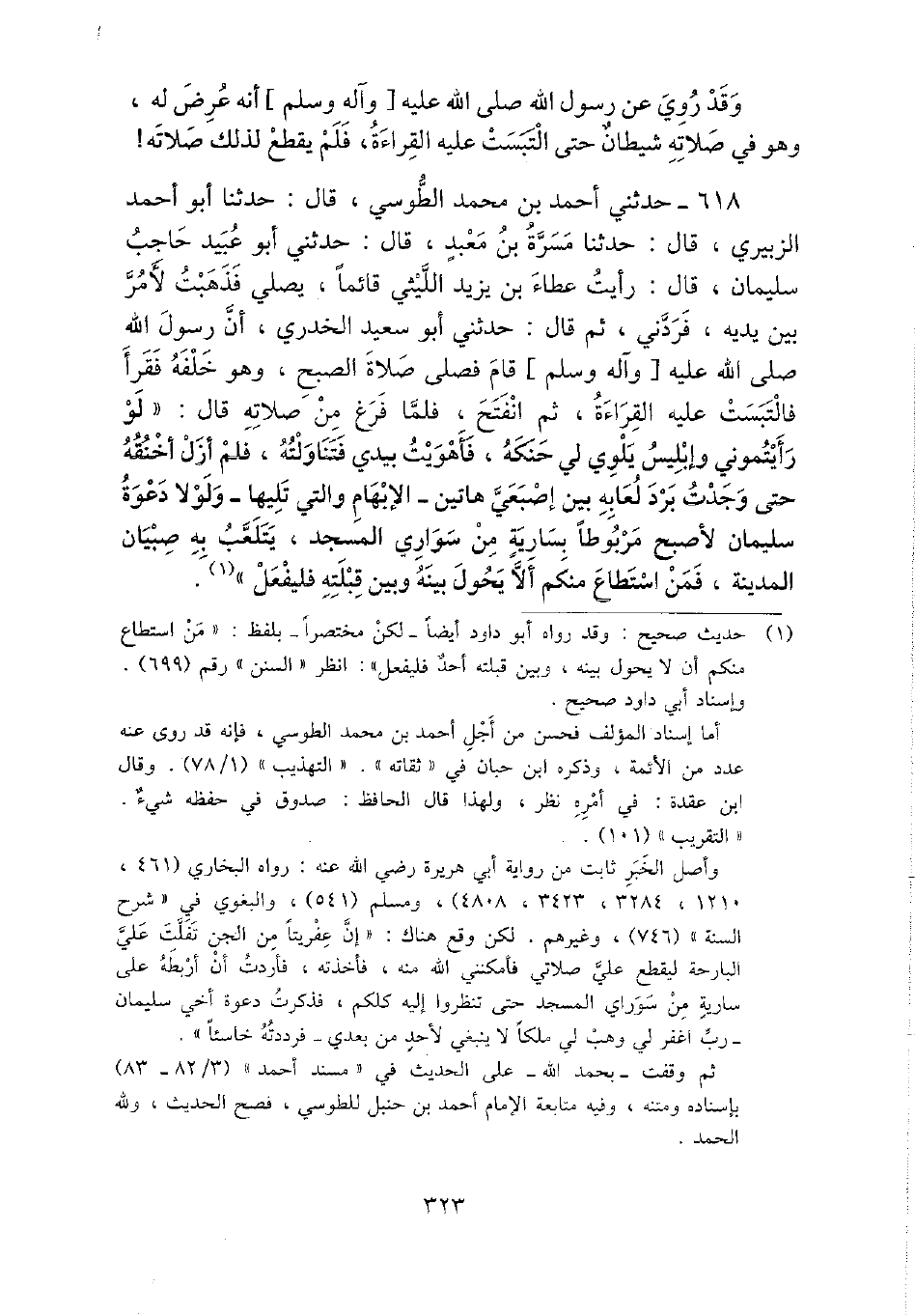618 - حَدثنِي أَحْمد بن مُحَمَّد الطوسي، قَالَ: حَدثنَا أَبُو أَحْمد الزبيرِي، قَالَ: حَدثنَا مَسَرَّة بن معبد، قَالَ: حَدثنِي أَبُو عبيد حَاجِب سُلَيْمَان، قَالَ: رَأَيْت عَطاء بن يزِيد اللَّيْثِيّ قَائِما، يُصَلِّي فَذَهَبت لأمر بَين يَدَيْهِ، فردني، ثمَّ قَالَ: حَدثنِي أَبُو سعيد الْخُدْرِيّ، أَن رَسُول الله - صَلَّى اللَّهُ عَلَيْهِ وَسَلَّم َ - قَامَ فصلى صَلَاة الصُّبْح، وَهُوَ خَلفه فَقَرَأَ فالتبست عَلَيْهِ الْقِرَاءَة، ثمَّ انْفَتح، فَلَمَّا فرغ من صلَاته قَالَ: " لَو رَأَيْتُمُونِي وإبليس يلوي لي حنكه، فَأَهْوَيْت بيَدي فتناولته، فَلم أزل أخنقه حَتَّى وجدت برد لعابه بَين إصبعي هَاتين - الْإِبْهَام وَالَّتِي تَلِيهَا - وَلَوْلَا دَعْوَة سُلَيْمَان لأصبح مربوطا بِسَارِيَة من سواري الْمَسْجِد، يتلعب بِهِ صبيان الْمَدِينَة، فَمن اسْتَطَاعَ مِنْكُم أَلا يحول بَينه وَبَين قبلته فَلْيفْعَل ".