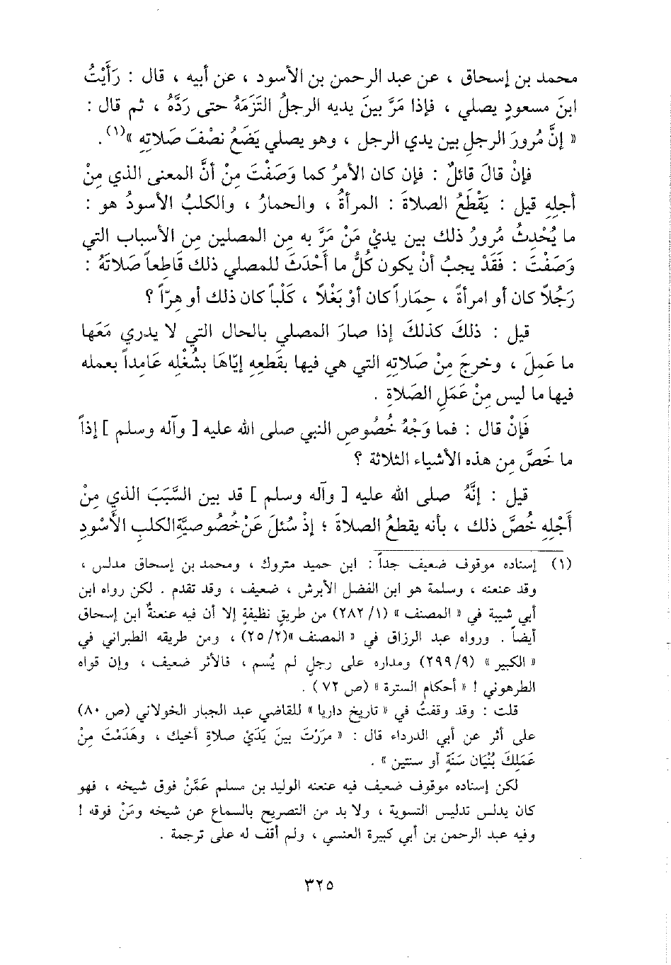 مُحَمَّد بن إِسْحَاق، عَن عبد الرَّحْمَن بن الْأسود، عَن أَبِيه، قَالَ: رَأَيْت ابْن مَسْعُود يُصَلِّي، فَإِذا مر بَين يَدَيْهِ الرجل الْتَزمهُ حَتَّى رده، ثمَّ قَالَ: " إِن مُرُور الرجل بَين يَدي الرجل، وَهُوَ يُصَلِّي يضع نصف صلَاته ".