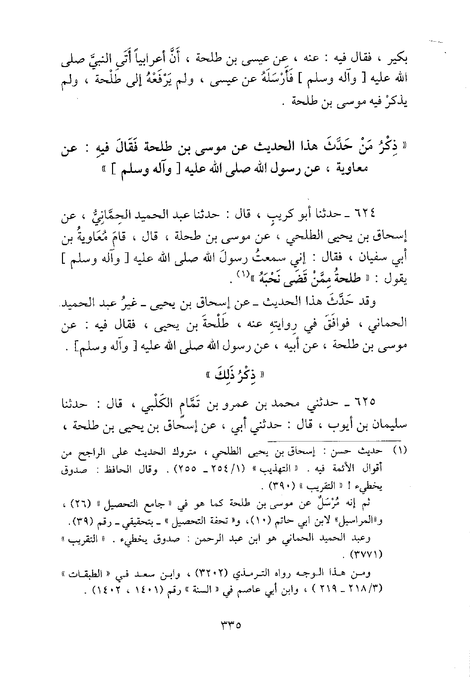 624 - حَدثنَا أَبُو كريب، قَالَ: حَدثنَا عبد الحميد الْحمانِي، عَن إِسْحَاق بن يحيى الطلحي، عَن مُوسَى بن طَلْحَة، قَالَ: قَامَ مُعَاوِيَة بن أبي سُفْيَان، فَقَالَ: إِنِّي سَمِعت رَسُول الله - صَلَّى اللَّهُ عَلَيْهِ وَسَلَّم َ - يَقُول: " طَلْحَة مِمَّن قضى نحبه ".