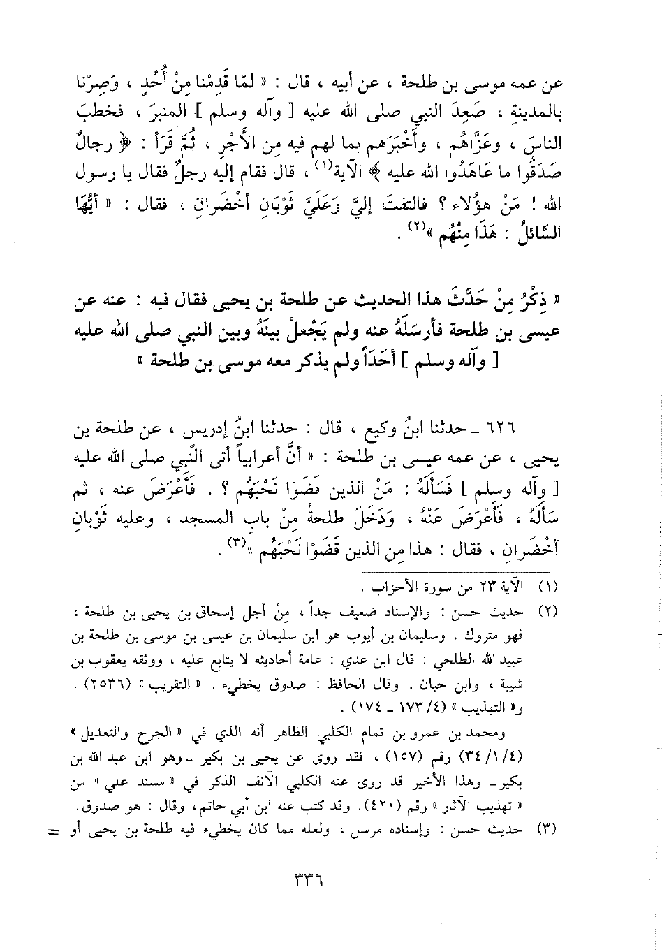 626 - حَدثنَا ابْن وَكِيع، قَالَ: حَدثنَا ابْن إِدْرِيس، عَن طَلْحَة بن يحيى، عَن عَمه عِيسَى بن طَلْحَة: " أَن أَعْرَابِيًا أَتَى النَّبِي - صَلَّى اللَّهُ عَلَيْهِ وَسَلَّم َ - فَسَأَلَهُ: من الَّذين قضوا نحبهمْ؟ فَأَعْرض عَنهُ، ثمَّ سَأَلَهُ، فَأَعْرض عَنهُ، وَدخل طَلْحَة من بَاب الْمَسْجِد، وَعَلِيهِ ثَوْبَان أخضران، فَقَالَ: هَذَا من الَّذين قضوا نحبهمْ ".