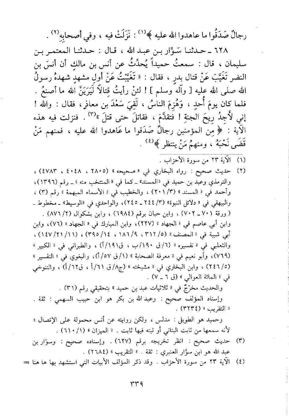 628 - حَدثنَا سوار بن عبد الله، قَالَ: حَدثنَا الْمُعْتَمِر بن سُلَيْمَان، قَالَ: سَمِعت حميدا يحدث عَن أنس بن مَالك أَن أنس بن النَّضر تغيب عَن قتال بدر، فَقَالَ: " تغيبت عَن أول مشْهد شهده رَسُول الله - صَلَّى اللَّهُ عَلَيْهِ وَسَلَّم َ - {لَئِن رَأَيْت قتالا ليرين الله مَا أصنع. فَلَمَّا كَانَ يَوْم أحد، وَهزمَ النَّاس، لَقِي سعد بن معَاذ، فَقَالَ: وَالله} إِنِّي لأجد ريح الْجنَّة! فَتقدم، فقاتل حَتَّى قتل ". فَنزلت فِيهِ هَذِه الْآيَة: {من الْمُؤمنِينَ رجال صدقُوا مَا عَاهَدُوا الله عَلَيْهِ، فَمنهمْ من قضى نحبه، وَمِنْهُم من ينْتَظر} .