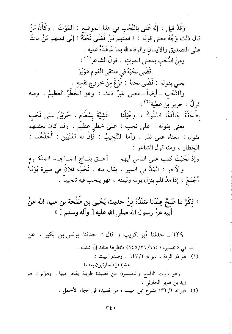 وَقد قيل: إِنَّه عَنى بالنحب فِي هَذَا الْموضع: الْمَوْت. وَكَأن من قَالَ ذَلِك وَجه معنى قَوْله: " فَمنهمْ من قضى نحبه " إِلَى فَمنهمْ من مَاتَ على التَّصْدِيق وَالْإِيمَان وَالْوَفَاء لله بِمَا عاهده عَلَيْهِ.