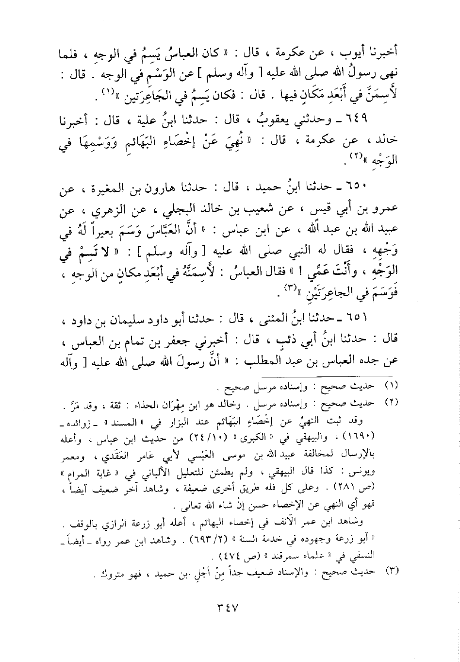 650 - حَدثنَا ابْن حميد، قَالَ: حَدثنَا هَارُون بن الْمُغيرَة، عَن عَمْرو بن أبي قيس، عَن شُعَيْب بن خَالِد البَجلِيّ، عَن الزُّهْرِيّ، عَن عبيد الله بن عبد الله، عَن ابْن عَبَّاس: " أَن الْعَبَّاس وسم بَعِيرًا لَهُ فِي وَجهه، فَقَالَ لَهُ النَّبِي - صَلَّى اللَّهُ عَلَيْهِ وَسَلَّم َ -: " لَا تسم فِي الْوَجْه، وَأَنت عمي! " فَقَالَ الْعَبَّاس: لأسمنه فِي أبعد مَكَان من الْوَجْه، فوسم فِي الْجَاعِرَتَيْنِ ".