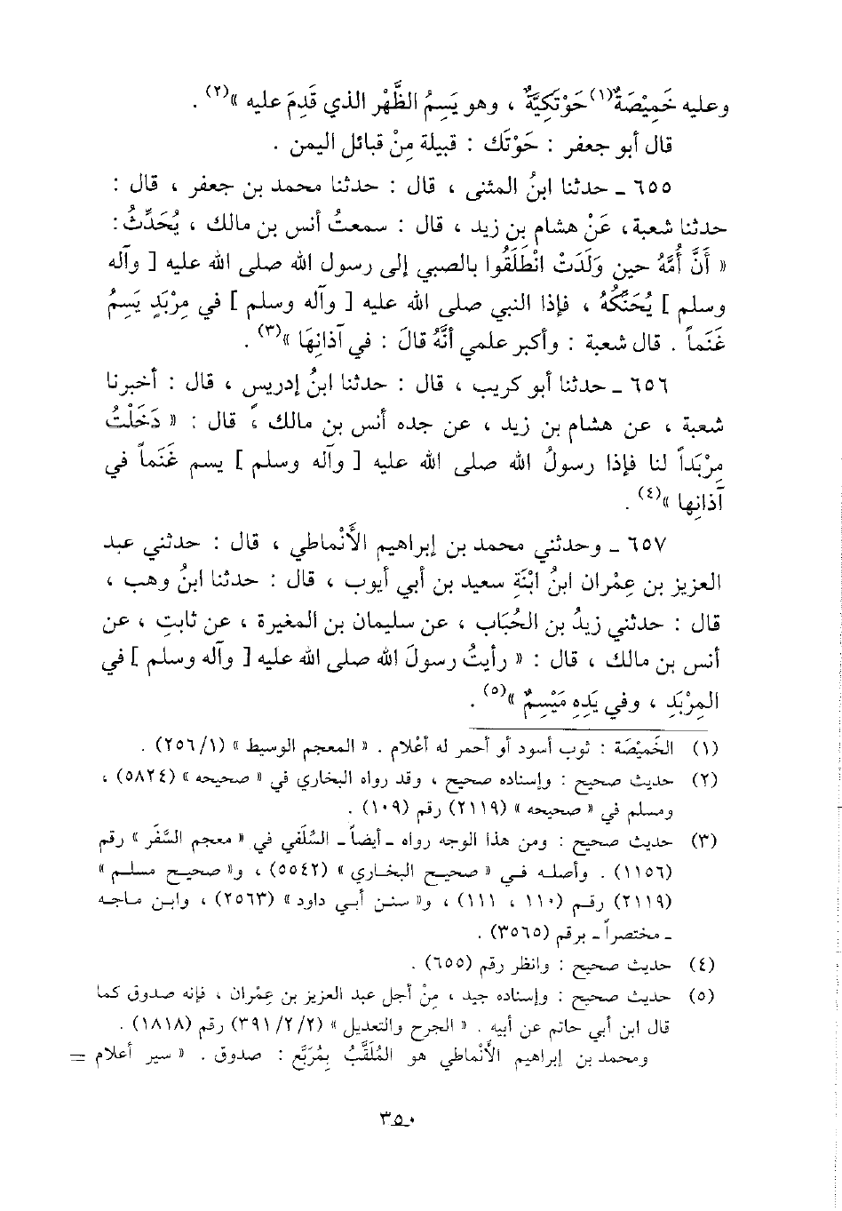 655 - حَدثنَا ابْن الْمثنى، قَالَ: حَدثنَا مُحَمَّد بن جَعْفَر، قَالَ: حَدثنَا شُعْبَة، عَن هِشَام بن زيد، قَالَ: سَمِعت أنس بن مَالك، يحدث: " أَن أمه حِين ولدت انْطَلقُوا بِالصَّبِيِّ إِلَى رَسُول الله - صَلَّى اللَّهُ عَلَيْهِ وَسَلَّم َ - يحنكه، فَإِذا النَّبِي - صَلَّى اللَّهُ عَلَيْهِ وَسَلَّم َ - فِي مربد يسم غنما. قَالَ شُعْبَة: وأكبر علمي أَنه قَالَ: فِي آذانها ".