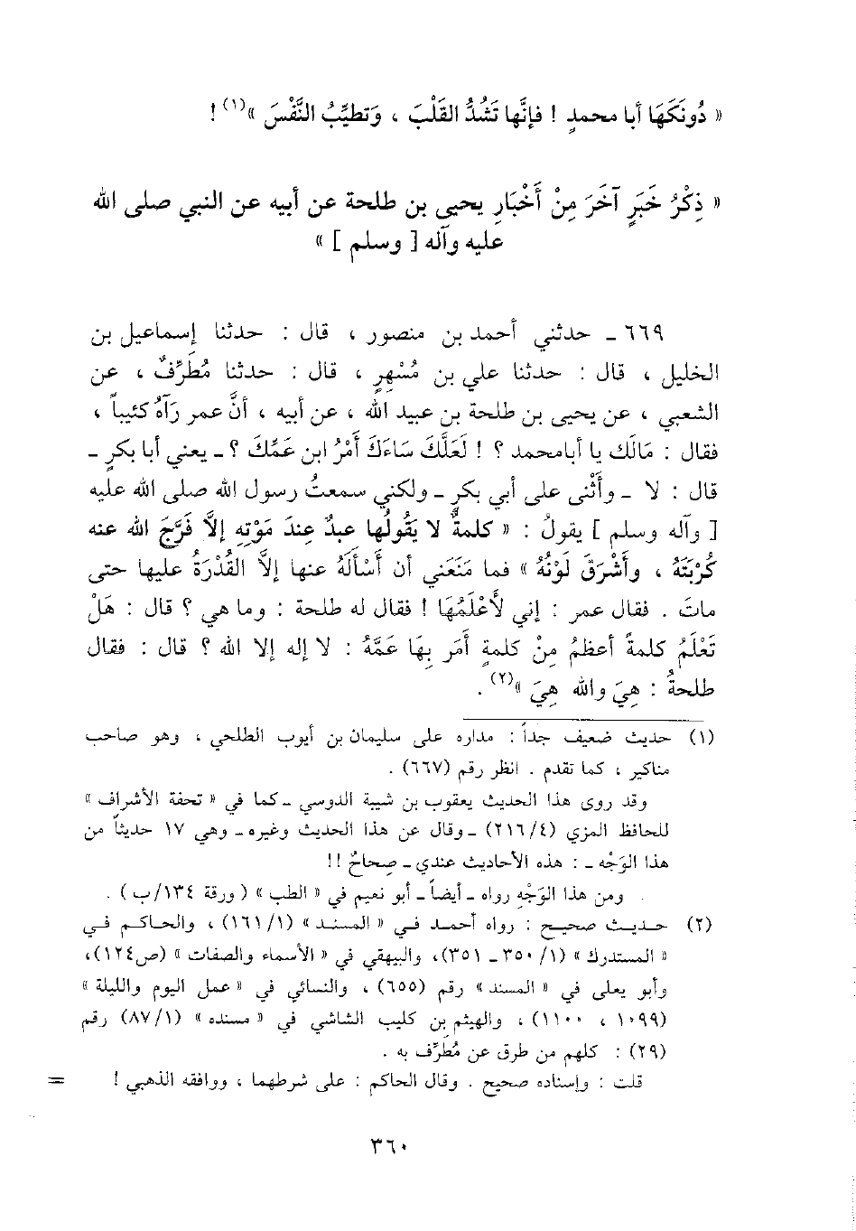 669 - حَدثنِي أَحْمد بن مَنْصُور، قَالَ: حَدثنَا إِسْمَاعِيل بن الْخَلِيل، قَالَ: حَدثنَا عَليّ بن مسْهر، قَالَ: حَدثنَا مطرف، عَن الشّعبِيّ، عَن يحيى بن طَلْحَة بن عبيد الله، عَن أَبِيه، أَن عمر رَآهُ كئيبا، فَقَالَ: مَالك يَا أَبَا مُحَمَّد؟ {لَعَلَّك ساءك أَمر ابْن عمك؟ - يَعْنِي أَبَا بكر - قَالَ: لَا - وَأثْنى على أبي بكر - وَلَكِنِّي سَمِعت رَسُول الله - صَلَّى اللَّهُ عَلَيْهِ وَسَلَّم َ - يَقُول: " كلمة لَا يَقُولهَا عبد عِنْد مَوته إِلَّا فرج الله عَنهُ كربته، وأشرق لَونه " فَمَا مَنَعَنِي أَن أسأله عَنْهَا إِلَّا الْقُدْرَة عَلَيْهَا حَتَّى مَاتَ. فَقَالَ عمر: إِنِّي لأعلمها} فَقَالَ لَهُ طَلْحَة: وَمَا هِيَ؟ قَالَ: هَل تعلم كلمة أعظم من كلمة أَمر بهَا عَمه: لَا إِلَه إِلَّا الله؟ قَالَ: فَقَالَ طَلْحَة: هِيَ وَالله هِيَ ".