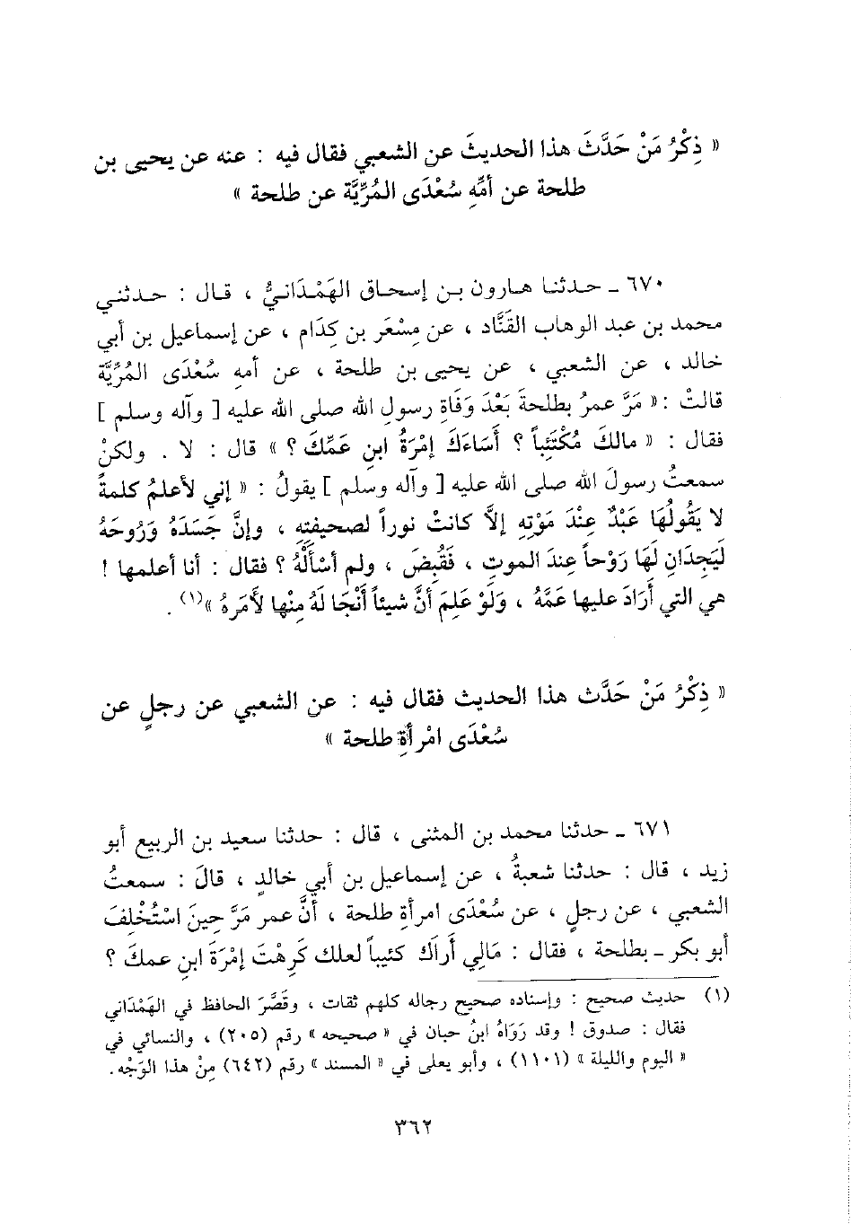 670 - حَدثنَا هَارُون بن إِسْحَاق الْهَمدَانِي، قَالَ: حَدثنِي مُحَمَّد بن عبد الْوَهَّاب القناد، عَن مسعر بن كدام، عَن إِسْمَاعِيل بن أبي خَالِد، عَن الشّعبِيّ، عَن يحيى بن طَلْحَة، عَن أمه سعدى المرية قَالَت: " مر عمر بطلحة بعد وَفَاة رَسُول الله - صَلَّى اللَّهُ عَلَيْهِ وَسَلَّم َ - فَقَالَ: " مَالك مكتئبا؟ أساءك إمرة ابْن عمك؟ " قَالَ: لَا. وَلَكِن سَمِعت رَسُول الله - صَلَّى اللَّهُ عَلَيْهِ وَسَلَّم َ - يَقُول: " إِنِّي لأعْلم كلمة لَا يَقُولهَا عبد عِنْد مَوته إِلَّا كَانَت نورا لصحيفته، وَإِن جسده وروحه ليجدان لَهَا روحا عِنْد الْمَوْت، فَقبض، وَلم أسأله؟ فَقَالَ: أَنا أعلمها! هِيَ الَّتِي أَرَادَ عَلَيْهَا عَمه، وَلَو علم أَن شَيْئا أنجا لَهُ مِنْهَا لأَمره ".