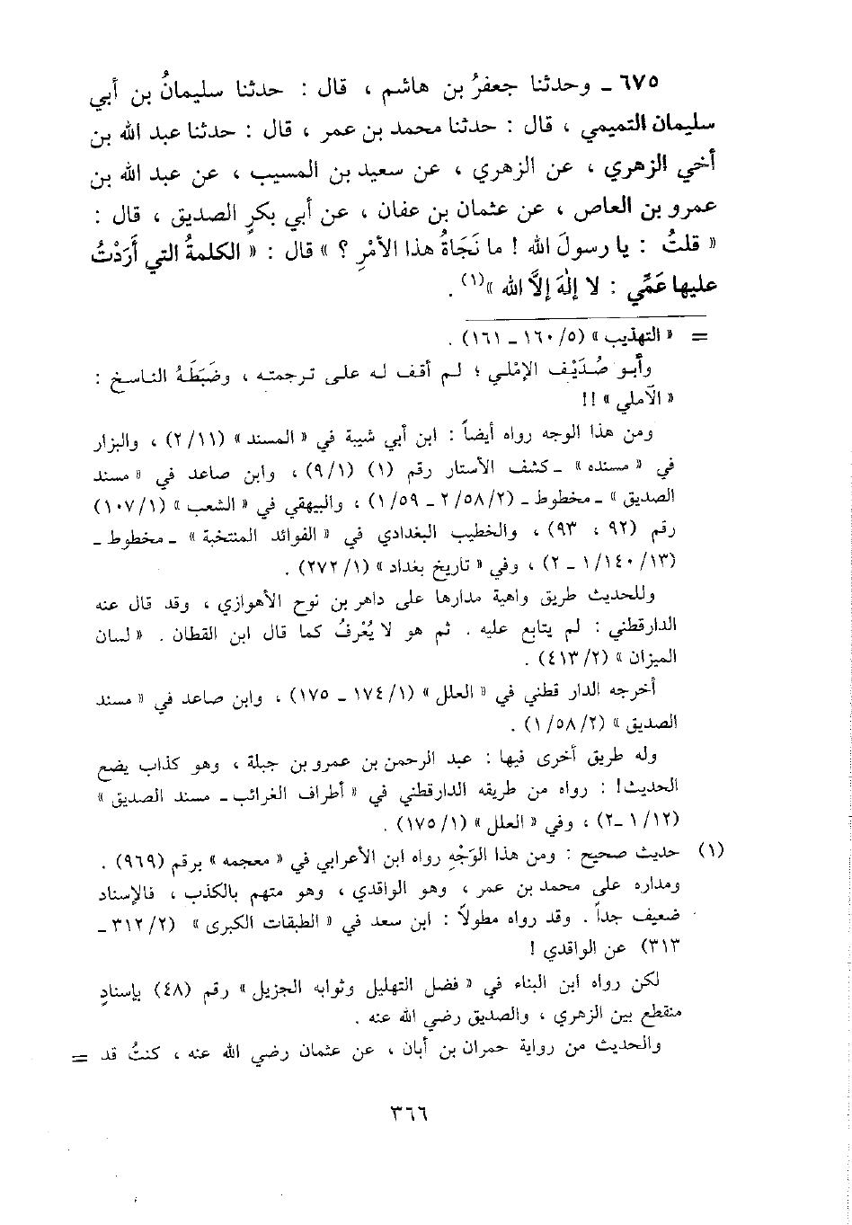 675 - وَحدثنَا جَعْفَر بن هَاشم، قَالَ: حَدثنَا سُلَيْمَان بن أبي سُلَيْمَان التَّمِيمِي، قَالَ: حَدثنَا مُحَمَّد بن عمر، قَالَ: حَدثنَا عبد الله بن أخي الزُّهْرِيّ، عَن الزُّهْرِيّ، عَن سعيد بن الْمسيب، عَن عبد الله بن عَمْرو بن الْعَاصِ، عَن عُثْمَان بن عَفَّان، عَن أبي بكر الصّديق، قَالَ: " قلت: يَا رَسُول الله! مَا نجاة هَذَا الْأَمر؟ " قَالَ: " الْكَلِمَة الَّتِي أردْت عَلَيْهَا عمي: لَا إِلَه إِلَّا الله ".