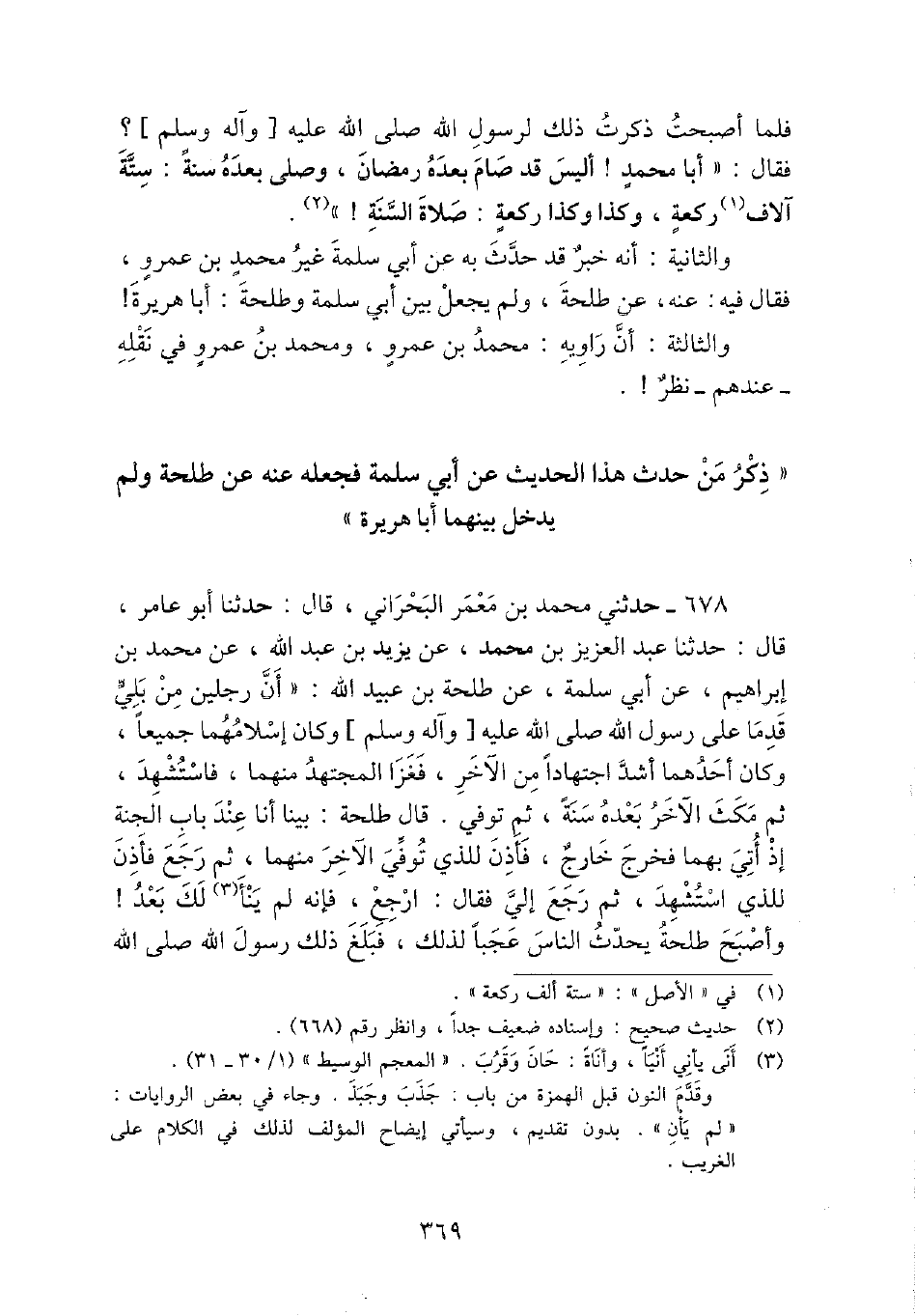 678 - حَدثنِي مُحَمَّد بن معمر البحراني، قَالَ: حَدثنَا أَبُو عَامر، قَالَ: حَدثنَا عبد الْعَزِيز بن مُحَمَّد، عَن يزِيد بن عبد الله، عَن مُحَمَّد بن إِبْرَاهِيم، عَن أبي سَلمَة، عَن طَلْحَة بن عبيد الله: " أَن رجلَيْنِ من بلي قدما على رَسُول الله - صَلَّى اللَّهُ عَلَيْهِ وَسَلَّم َ - وَكَانَ إسلامهما جَمِيعًا، وَكَانَ أَحدهمَا أَشد اجْتِهَادًا من الآخر، فغزا الْمُجْتَهد مِنْهُمَا، فاستشهد، ثمَّ مكث الآخر بعده سنة، ثمَّ توفّي. قَالَ طَلْحَة: بَينا أَنا عِنْد بَاب الْجنَّة إِذْ أُتِي بهما فَخرج خَارج، فَأذن للَّذي توفّي الآخر مِنْهُمَا، ثمَّ رَجَعَ فَأذن للَّذي اسْتشْهد، ثمَّ رَجَعَ إِلَيّ فَقَالَ: ارْجع، فَإِنَّهُ لم ينأ لَك بعد! وَأصْبح طَلْحَة يحدث النَّاس عجبا لذَلِك، فَبلغ ذَلِك رَسُول الله - صَلَّى اللَّهُ عَلَيْهِ وَسَلَّم َ -
