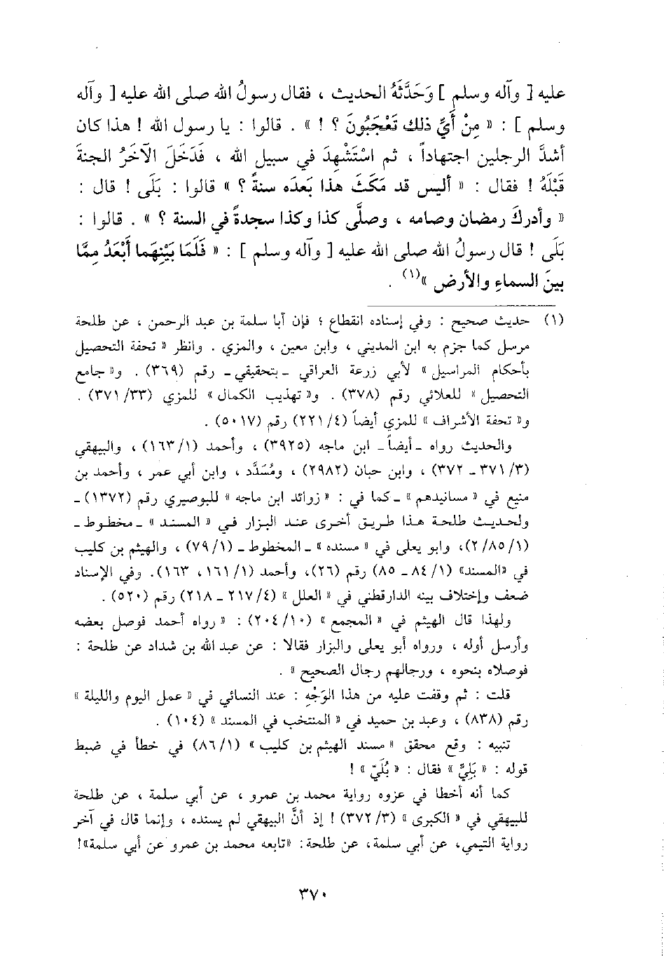 وحدثه الحَدِيث، فَقَالَ رَسُول الله - صَلَّى اللَّهُ عَلَيْهِ وَسَلَّم َ -: " من أَي ذَلِك تعْجبُونَ؟ {". قَالُوا: يَا رَسُول الله} هَذَا كَانَ أَشد الرجلَيْن اجْتِهَادًا، ثمَّ اسْتشْهد فِي سَبِيل الله، فَدخل الآخر الْجنَّة قبله {فَقَالَ: " أَلَيْسَ قد مكث هَذَا بعده سنة؟ " قَالُوا: بلَى} قَالَ: " وَأدْركَ رَمَضَان وصامه، وَصلى كَذَا وَكَذَا سَجْدَة فِي السّنة؟ ". قَالُوا: بلَى! قَالَ رَسُول الله - صَلَّى اللَّهُ عَلَيْهِ وَسَلَّم َ -: " فَلَمَّا بَينهمَا أبعد مِمَّا بَين السَّمَاء وَالْأَرْض ".