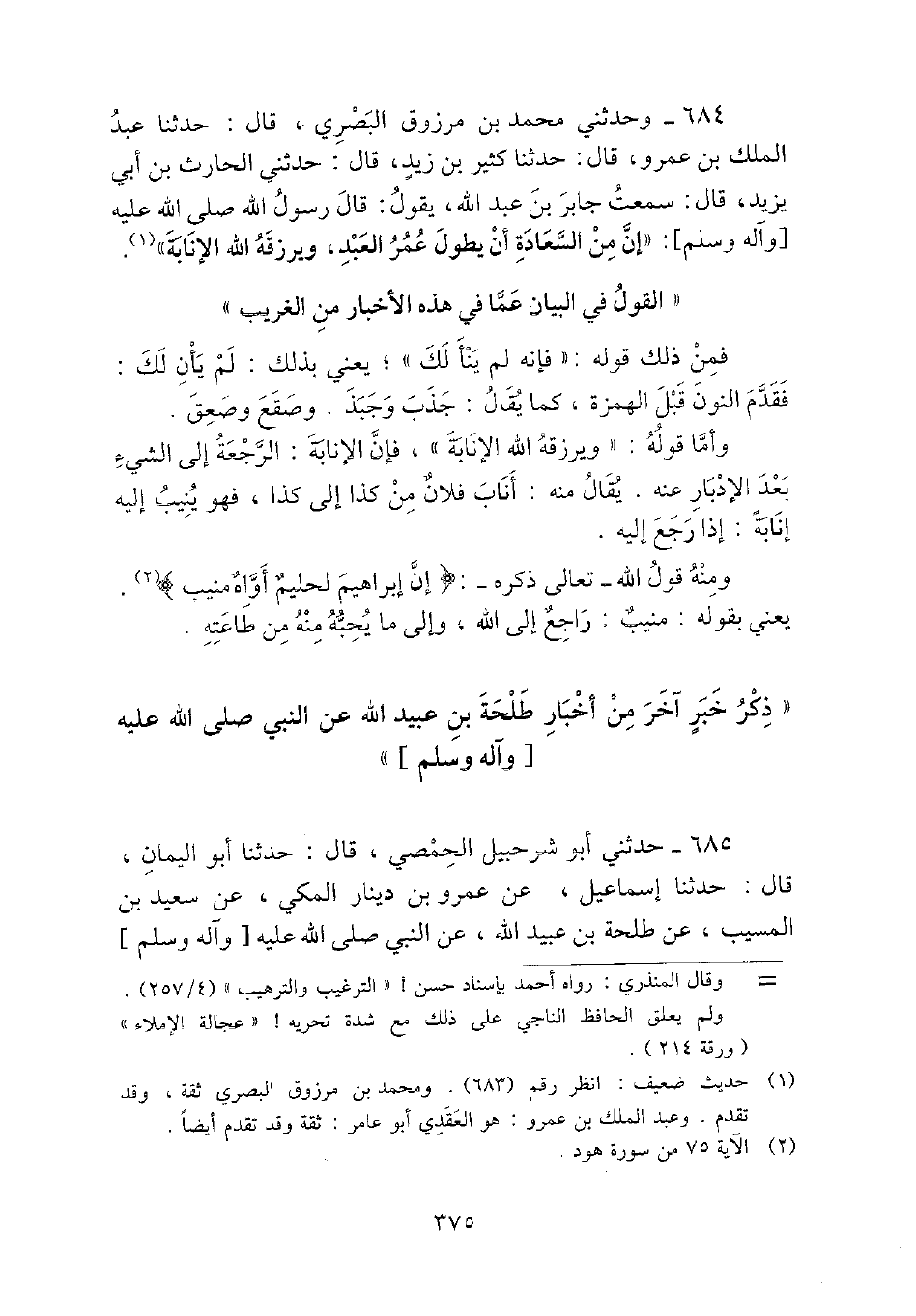 684 - وحَدثني مُحَمَّد بن مَرْزُوق الْبَصْرِيّ، قَالَ: حَدثنَا عبد الْملك بن عَمْرو، قَالَ: حَدثنَا كثير بن زيد، قَالَ: حَدثنِي الْحَارِث بن أبي يزِيد، قَالَ: سَمِعت جَابر بن عبد الله، يَقُول: قَالَ رَسُول الله - صَلَّى اللَّهُ عَلَيْهِ وَسَلَّم َ -: " إِن من السَّعَادَة أَن يطول عمر العَبْد، وَيَرْزقهُ الله الْإِنَابَة ".