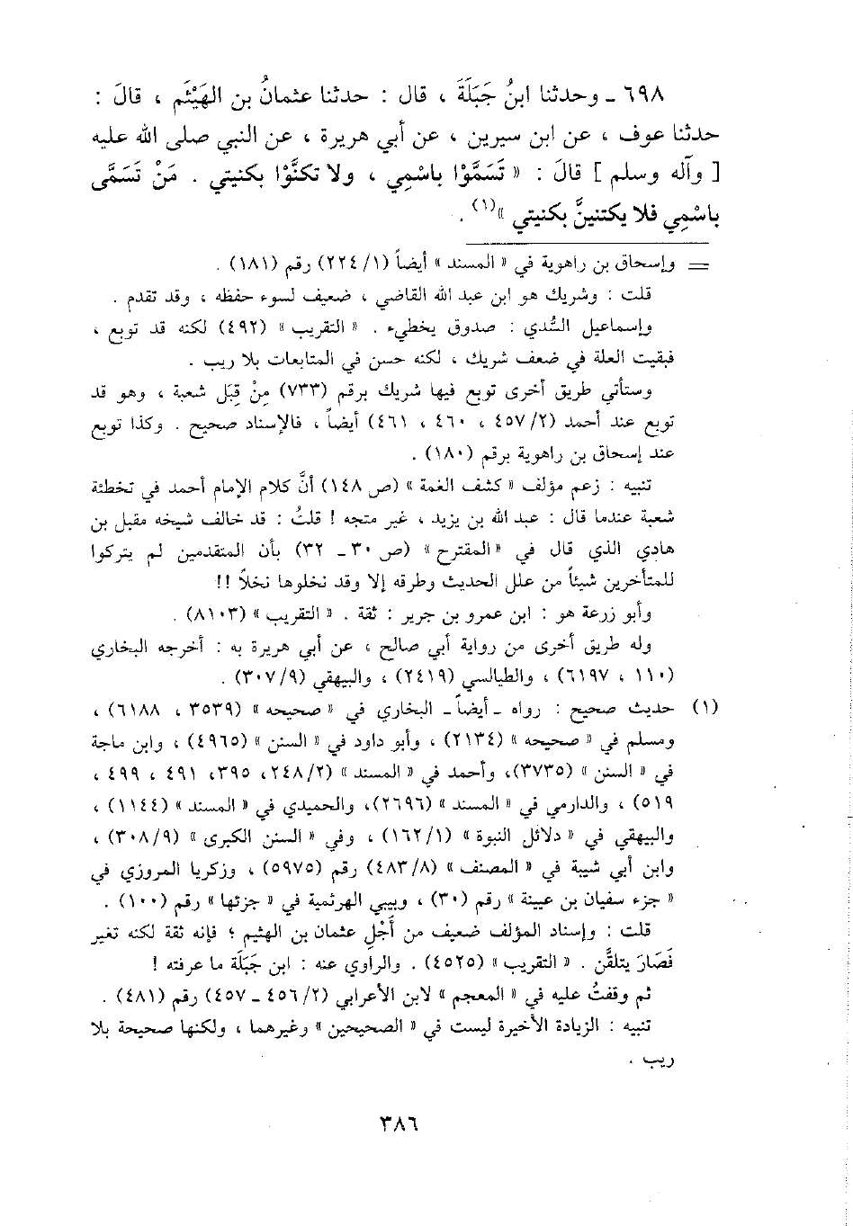 698 - وَحدثنَا ابْن جبلة، قَالَ: حَدثنَا عُثْمَان بن الْهَيْثَم، قَالَ: حَدثنَا عَوْف، عَن ابْن سِيرِين، عَن أبي هُرَيْرَة، عَن النَّبِي - صَلَّى اللَّهُ عَلَيْهِ وَسَلَّم َ - قَالَ: " تسموا باسمي، وَلَا تكنوا بكنيتي. من تسمى باسمي فَلَا يكتنين بكنيتي ".