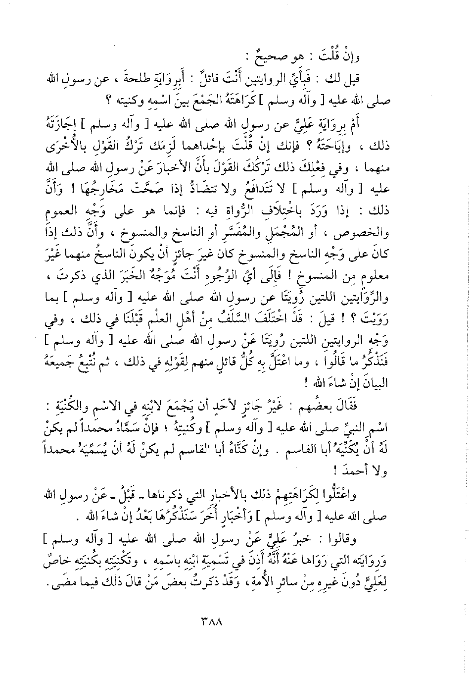 قيل لَك: فَبِأَي الرِّوَايَتَيْنِ أَنْت قَائِل: أبرواية طَلْحَة، عَن رَسُول الله - صَلَّى اللَّهُ عَلَيْهِ وَسَلَّم َ - كَرَاهَته الْجمع بَين اسْمه وكنيته؟