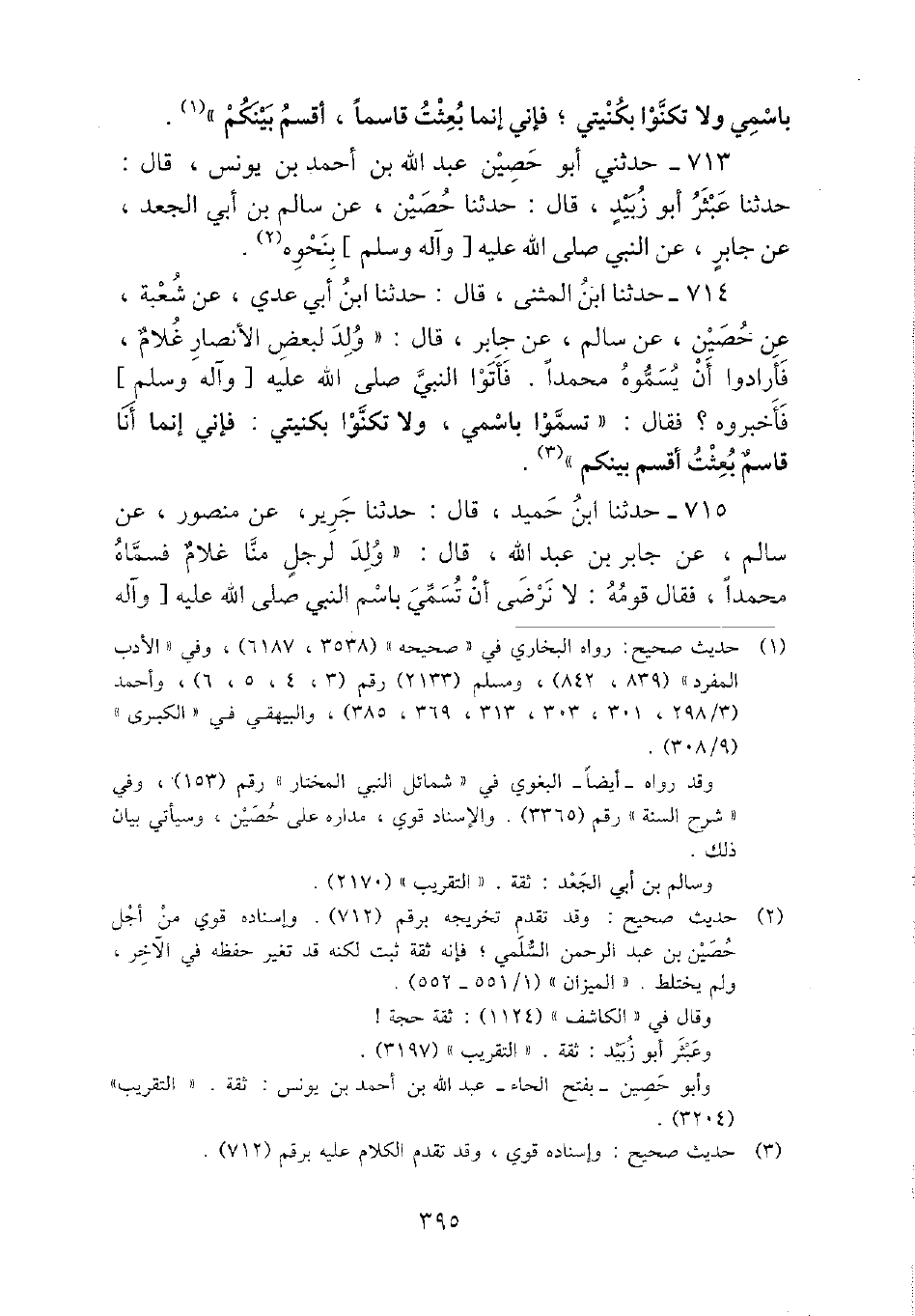 715 - حَدثنَا ابْن حميد، قَالَ: حَدثنَا جرير، عَن مَنْصُور، عَن سَالم، عَن جَابر بن عبد الله، قَالَ: " ولد لرجل منا غُلَام فَسَماهُ مُحَمَّدًا، فَقَالَ قومه: لَا نرضى أَن تسمي باسم النَّبِي - صَلَّى اللَّهُ عَلَيْهِ وَسَلَّم َ -