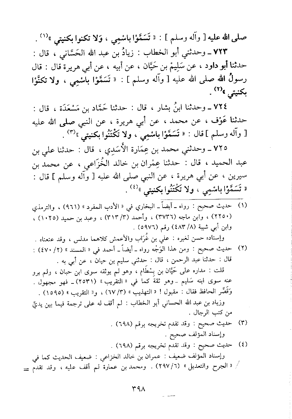 725 - وحَدثني مُحَمَّد بن عمَارَة الْأَسدي، قَالَ: حَدثنَا عَليّ بن عبد الحميد، قَالَ: حَدثنَا عمرَان بن خَالِد الْخُزَاعِيّ، عَن مُحَمَّد بن سِيرِين، عَن أبي هُرَيْرَة، عَن النَّبِي - صَلَّى اللَّهُ عَلَيْهِ وَسَلَّم َ - قَالَ: " تسموا باسمي، وَلَا تكتنوا بكنيتي ".