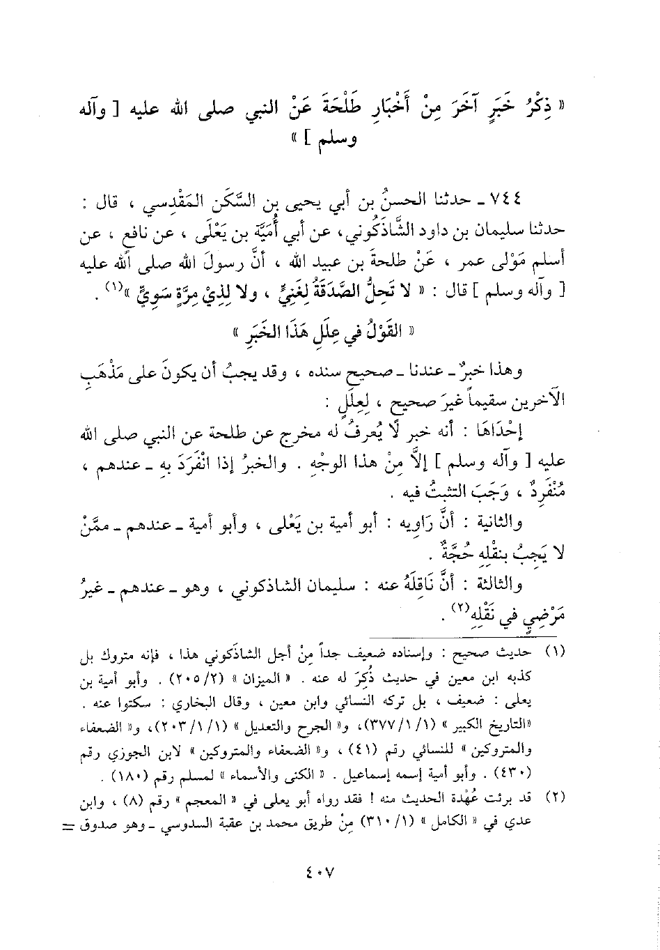 744 - حَدثنَا الْحسن بن أبي يحيى بن السكن الْمَقْدِسِي، قَالَ: حَدثنَا سُلَيْمَان بن دَاوُد الشَّاذكُونِي، عَن أبي أُميَّة بن يعلى، عَن نَافِع، عَن أسلم مولى عمر، عَن طَلْحَة بن عبيد الله، أَن رَسُول الله - صَلَّى اللَّهُ عَلَيْهِ وَسَلَّم َ - قَالَ: " لَا تحل الصَّدَقَة لَغَنِيّ، وَلَا لذِي مرّة سوي ".