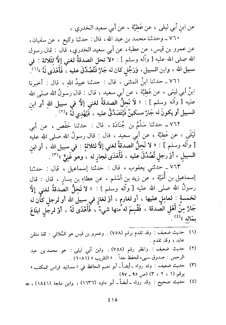 761 - حَدثنَا ابْن الْمثنى، قَالَ: حَدثنَا عبيد الله، قَالَ: أخبرنَا ابْن أبي ليلى، عَن عَطِيَّة، عَن أبي سعيد، قَالَ: قَالَ رَسُول الله - صَلَّى اللَّهُ عَلَيْهِ وَسَلَّم َ -: " لَا تحل الصَّدَقَة لَغَنِيّ إِلَّا فِي سَبِيل الله أَو ابْن السَّبِيل أَو يكون لَهُ جَار مِسْكين فَيتَصَدَّق عَلَيْهِ، فيهدي لَهُ ".