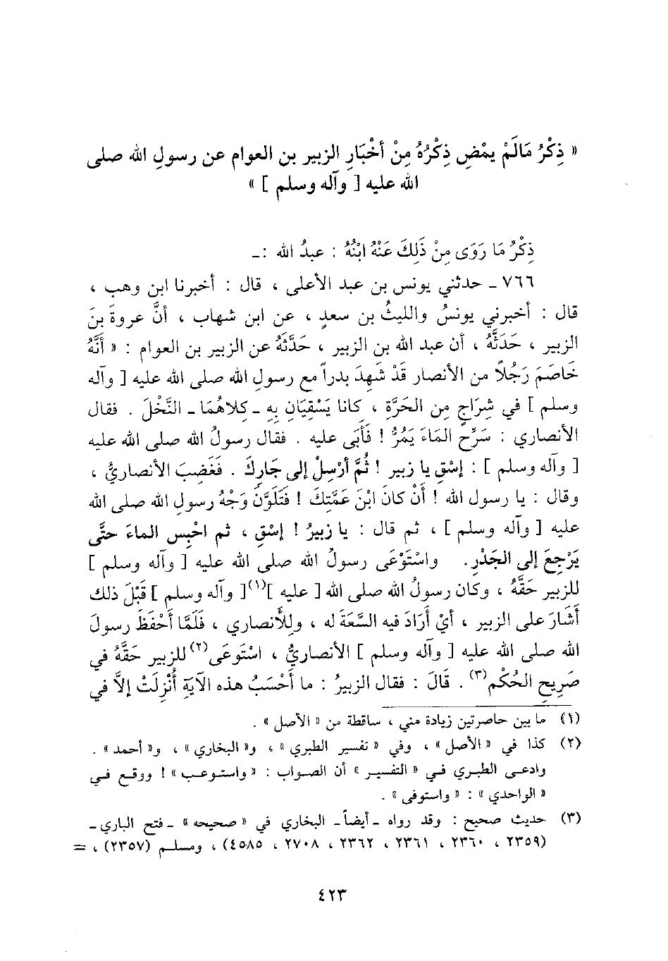766 - حَدثنِي يُونُس بن عبد الْأَعْلَى، قَالَ: أخبرنَا ابْن وهب، قَالَ: أَخْبرنِي يُونُس وَاللَّيْث بن سعد، عَن ابْن شهَاب، أَن عُرْوَة بن الزبير، حَدثهُ، أَن عبد الله بن الزبير، حَدثهُ عَن الزبير بن الْعَوام: " أَنه خَاصم رجلا من الْأَنْصَار قد شهد بَدْرًا مَعَ رَسُول الله - صَلَّى اللَّهُ عَلَيْهِ وَسَلَّم َ - فِي شراج من الْحرَّة، كَانَا يسقيان بِهِ - كِلَاهُمَا - النّخل. فَقَالَ الْأنْصَارِيّ: سرح المَاء يمر {فَأبى عَلَيْهِ. فَقَالَ رَسُول الله - صَلَّى اللَّهُ عَلَيْهِ وَسَلَّم َ -: إسق يَا زبير} ثمَّ أرسل إِلَى جَارك. فَغَضب الْأنْصَارِيّ، وَقَالَ: يَا رَسُول الله {أَن كَانَ ابْن عَمَّتك} فَتَلَوَّنَ وَجه رَسُول الله - صَلَّى اللَّهُ عَلَيْهِ وَسَلَّم َ -، ثمَّ قَالَ: يَا زبير! إسق، ثمَّ احْبِسْ المَاء حَتَّى يرجع إِلَى الْجدر. واستوعى رَسُول الله - صَلَّى اللَّهُ عَلَيْهِ وَسَلَّم َ - للزبير حَقه، وَكَانَ رَسُول الله - صَلَّى اللَّهُ عَلَيْهِ وَسَلَّم َ - قبل ذَلِك أَشَارَ على الزبير، أَي أَرَادَ فِيهِ السعَة لَهُ، وللأنصاري، فَلَمَّا أحفظ رَسُول الله - صَلَّى اللَّهُ عَلَيْهِ وَسَلَّم َ - الْأنْصَارِيّ، استوعى للزبير حَقه فِي صَرِيح الحكم. قَالَ: فَقَالَ الزبير: مَا أَحسب هَذِه الْآيَة أنزلت إِلَّا فِي