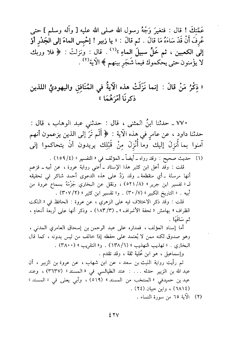 770 - حَدثنَا ابْن الْمثنى، قَالَ: حَدثنِي عبد الْوَهَّاب، قَالَ: حَدثنَا دَاوُد، عَن عَامر فِي هَذِه الْآيَة: {ألم تَرَ إِلَى الَّذين يَزْعمُونَ أَنهم آمنُوا بِمَا أنزل إِلَيْك وَمَا أنزل من قبلك يُرِيدُونَ أَن يتحاكموا إِلَى