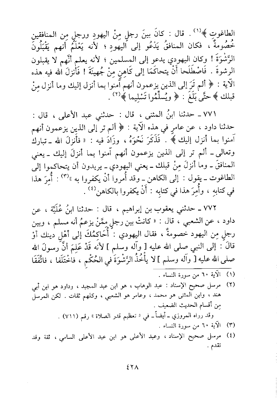 772 - حَدثنِي يَعْقُوب بن إِبْرَاهِيم، قَالَ: حَدثنَا ابْن علية، عَن دَاوُد، عَن الشّعبِيّ، قَالَ: " كَانَت بَين رجل مِمَّن يزْعم أَنه مُسلم، وَبَين رجل من الْيَهُود خُصُومَة، فَقَالَ الْيَهُودِيّ: أحاكمك إِلَى أهل دينك أَو قَالَ: إِلَى النَّبِي - صَلَّى اللَّهُ عَلَيْهِ وَسَلَّم َ - لِأَنَّهُ قد علم أَن رَسُول الله - صَلَّى اللَّهُ عَلَيْهِ وَسَلَّم َ - لَا يَأْخُذ الرِّشْوَة فِي الحكم، فاختلفا، فاتفقا