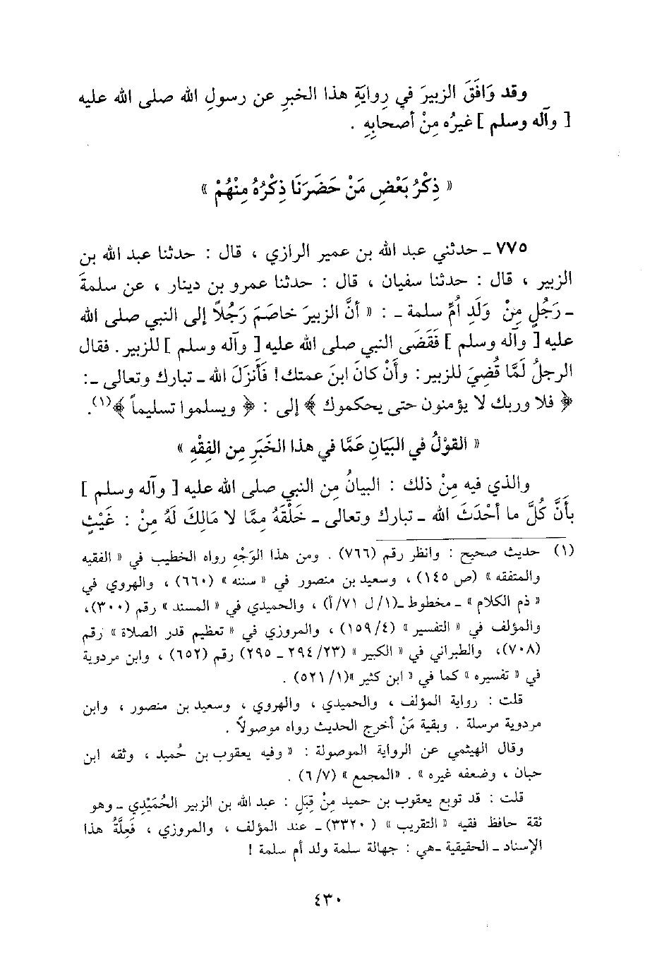 775 - حَدثنِي عبد الله بن عُمَيْر الرَّازِيّ، قَالَ: حَدثنَا عبد الله بن الزبير، قَالَ: حَدثنَا سُفْيَان، قَالَ: حَدثنَا عَمْرو بن دِينَار، عَن سَلمَة - رجل من ولد أم سَلمَة -: " أَن الزبير خَاصم رجلا إِلَى النَّبِي - صَلَّى اللَّهُ عَلَيْهِ وَسَلَّم َ - فَقضى النَّبِي - صَلَّى اللَّهُ عَلَيْهِ وَسَلَّم َ - للزبير. فَقَالَ الرجل لما قضي للزبير: وَأَن كَانَ ابْن عَمَّتك! فَأنْزل الله - تبَارك وَتَعَالَى -: {فَلَا وَرَبك لَا يُؤمنُونَ حَتَّى يُحَكِّمُوك} إِلَى: {ويسلموا تَسْلِيمًا} .