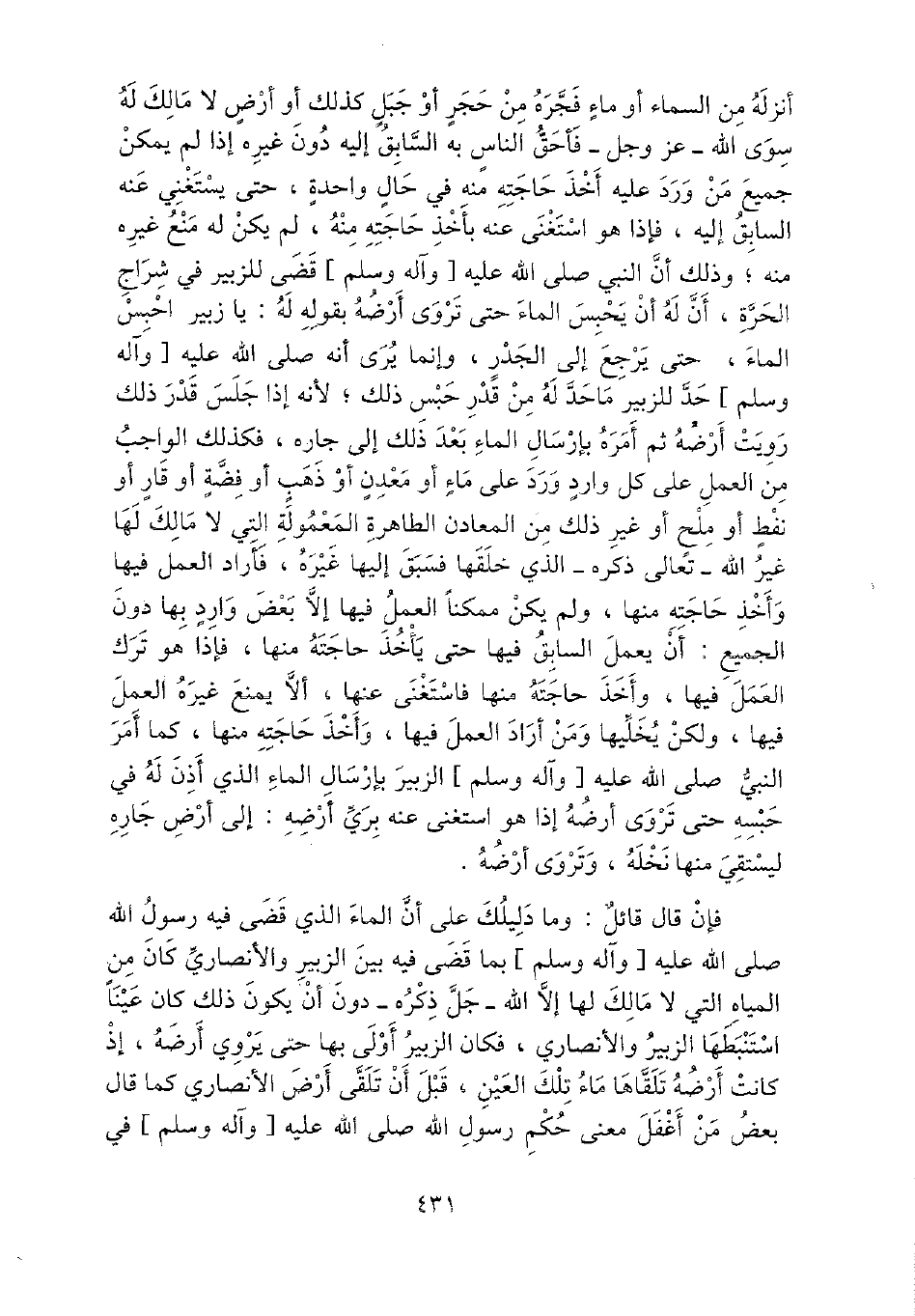 أنزلهُ من السَّمَاء أَو مَاء فجره من حجر أَو جبل كَذَلِك أَو أَرض لَا مَالك لَهُ سوى الله - عز وَجل - فأحق النَّاس بِهِ السَّابِق إِلَيْهِ دون غَيره إِذا لم يُمكن جَمِيع من ورد عَلَيْهِ أَخذ حَاجته مِنْهُ فِي حَال وَاحِدَة، حَتَّى يَسْتَغْنِي عَنهُ السَّابِق إِلَيْهِ، فَإِذا هُوَ اسْتغنى عَنهُ بِأخذ حَاجته مِنْهُ، لم يكن لَهُ منع غَيره مِنْهُ؛ وَذَلِكَ أَن النَّبِي - صَلَّى اللَّهُ عَلَيْهِ وَسَلَّم َ - قضى للزبير فِي شراج الْحرَّة، أَن لَهُ أَن يحبس المَاء حَتَّى تروى أرضه بقوله لَهُ: يَا زبير احْبِسْ المَاء، حَتَّى يرجع إِلَى الْجدر، وَإِنَّمَا يرى أَنه - صَلَّى اللَّهُ عَلَيْهِ وَسَلَّم َ - حد للزبير مَا حد لَهُ من قدر حبس ذَلِك؛ لِأَنَّهُ إِذا جلس قدر ذَلِك رويت أرضه ثمَّ أمره بإرسال المَاء بعد ذَلِك إِلَى جَاره، فَكَذَلِك الْوَاجِب من الْعَمَل على كل وَارِد ورد على مَاء أَو مَعْدن أَو ذهب أَو فضَّة أَو قار أَو نفط أَو ملح أَو غير ذَلِك من الْمَعَادِن الطاهرة المعمولة الَّتِي لَا مَالك لَهَا غير الله - تَعَالَى ذكره - الَّذِي خلقهَا فَسبق إِلَيْهَا غَيره، فَأَرَادَ الْعَمَل فِيهَا وَأخذ حَاجته مِنْهَا، وَلم يكن مُمكنا الْعَمَل فِيهَا إِلَّا بعض وَارِد بهَا دون الْجَمِيع: أَن يعْمل السَّابِق فِيهَا حَتَّى يَأْخُذ حَاجته مِنْهَا، فَإِذا هُوَ ترك الْعَمَل فِيهَا، وَأخذ حَاجته مِنْهَا فاستغنى عَنْهَا، أَلا يمْنَع غَيره الْعَمَل فِيهَا، وَلَكِن يخليها وَمن أَرَادَ الْعَمَل فِيهَا، وَأخذ حَاجته مِنْهَا، كَمَا أَمر النَّبِي - صَلَّى اللَّهُ عَلَيْهِ وَسَلَّم َ - الزبير بإرسال المَاء الَّذِي أذن لَهُ فِي حَبسه حَتَّى تروى أرضه إِذا هُوَ اسْتغنى عَنهُ بري أرضه: إِلَى أَرض جَاره ليستقي مِنْهَا نَخْلَة، وتروى أرضه.