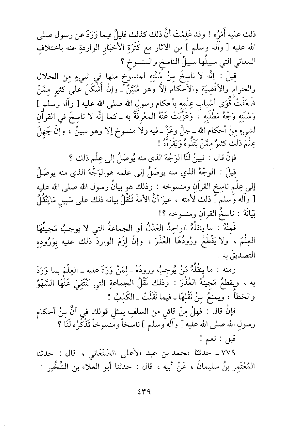 779 - حَدثنَا مُحَمَّد بن عبد الْأَعْلَى الصَّنْعَانِيّ، قَالَ: حَدثنَا الْمُعْتَمِر بن سُلَيْمَان، عَن أَبِيه، قَالَ: حَدثنَا أَبُو الْعَلَاء بن الشخير: