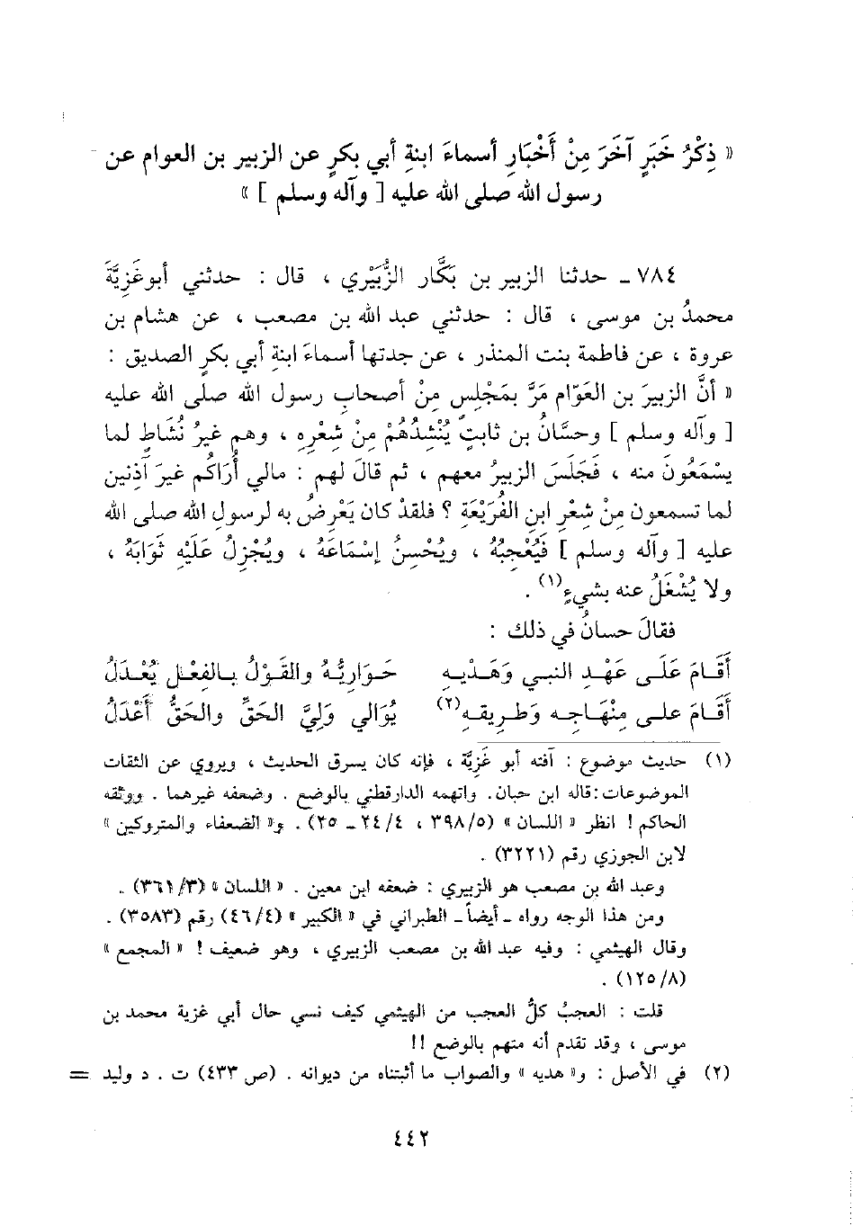 784 - حَدثنَا الزبير بن بكار الزبيرِي، قَالَ: حَدثنِي أَبُو غزيَّة مُحَمَّد بن مُوسَى، قَالَ: حَدثنِي عبد الله بن مُصعب، عَن هِشَام بن عُرْوَة، عَن فَاطِمَة بنت الْمُنْذر، عَن جدَّتهَا أَسمَاء ابْنة أبي بكر الصّديق: " أَن الزبير بن الْعَوام مر بِمَجْلِس من أَصْحَاب رَسُول الله - صَلَّى اللَّهُ عَلَيْهِ وَسَلَّم َ - وَحسان بن ثَابت ينشدهم من شعره، وهم غير نشاط لما يسمعُونَ مِنْهُ، فَجَلَسَ الزبير مَعَهم، ثمَّ قَالَ لَهُم: مَالِي أَرَاكُم غير آذنين لما تَسْمَعُونَ من شعر ابْن الفريعة؟ فَلَقَد كَانَ يعرض بِهِ لرَسُول الله - صَلَّى اللَّهُ عَلَيْهِ وَسَلَّم َ - فيعجبه، وَيحسن إسماعه، ويجزل عَلَيْهِ ثَوَابه، وَلَا يشغل عَنهُ بِشَيْء.