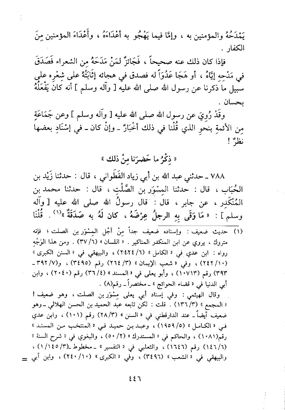 788 - حَدثنِي عبد الله بن أبي زِيَاد الْقَطوَانِي، قَالَ: حَدثنَا زيد بن الْحباب، قَالَ: حَدثنَا الْمسور بن الصَّلْت، قَالَ: حَدثنَا مُحَمَّد بن الْمُنْكَدر، عَن جَابر، قَالَ: قَالَ رَسُول الله - صَلَّى اللَّهُ عَلَيْهِ وَسَلَّم َ -: " مَا وقى بِهِ الرجل عرضه، كَانَ لَهُ بِهِ صَدَقَة ". قُلْنَا
