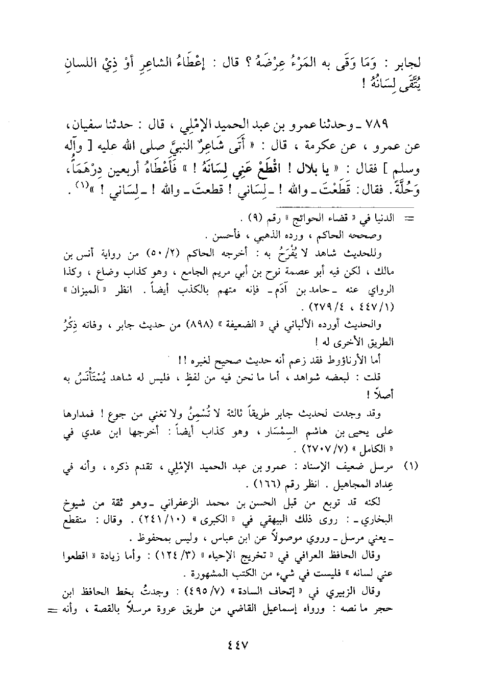 789 - وَحدثنَا عَمْرو بن عبد الحميد الإملي، قَالَ: حَدثنَا سُفْيَان، عَن عَمْرو، عَن عِكْرِمَة، قَالَ: " أَتَى شَاعِر النَّبِي - صَلَّى اللَّهُ عَلَيْهِ وَسَلَّم َ - فَقَالَ: " يَا بِلَال} اقْطَعْ عني لِسَانه {" فَأعْطَاهُ أَرْبَعِينَ درهما، وحلة. فَقَالَ: قطعت - وَالله} - لساني {قطعت - وَالله} - لساني! ".
