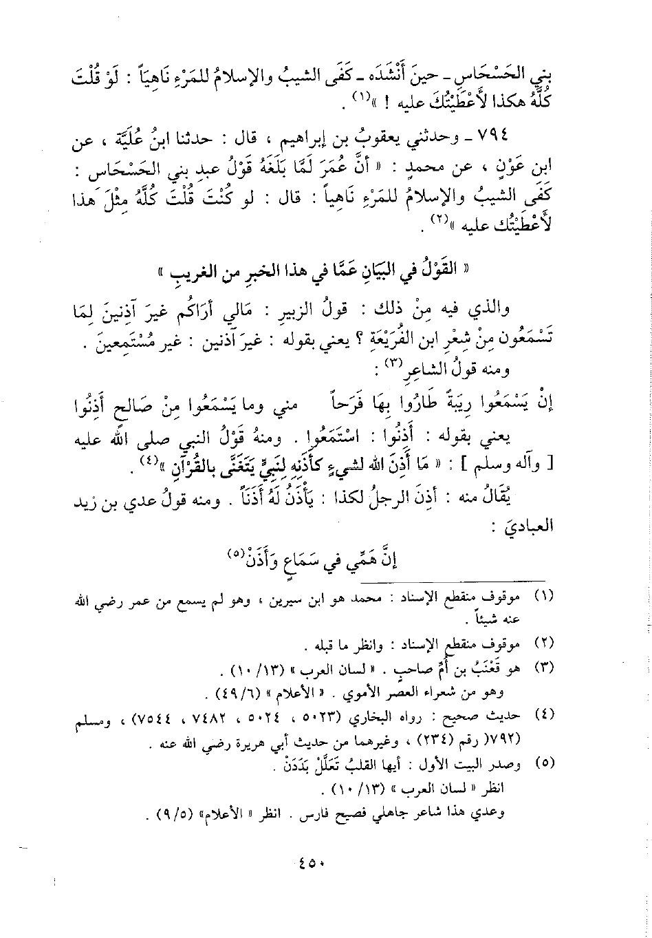 794 - وحَدثني يَعْقُوب بن إِبْرَاهِيم، قَالَ: حَدثنَا ابْن علية، عَن ابْن عون، عَن مُحَمَّد: " أَن عمر لما بلغه قَول عبد بني الحسحاس: كفى الشيب وَالْإِسْلَام للمرء ناهيا: قَالَ: لَو كنت قلت كُله مثل هَذَا لأعطيتك عَلَيْهِ ".