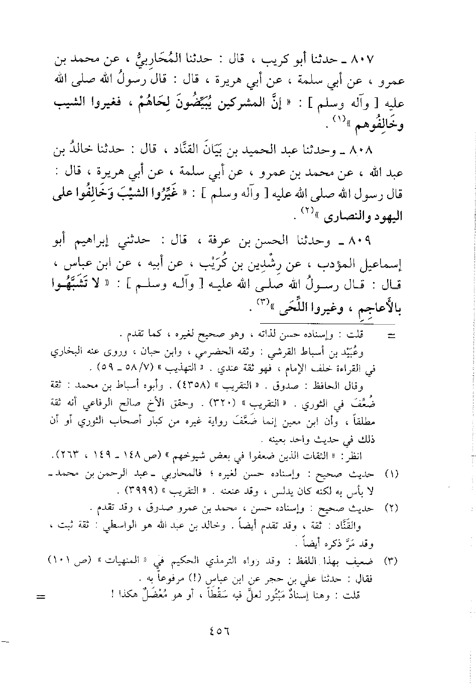 808 - وَحدثنَا عبد الحميد بن بَيَان القناد، قَالَ: حَدثنَا خَالِد بن عبد الله، عَن مُحَمَّد بن عَمْرو، عَن أبي سَلمَة، عَن أبي هُرَيْرَة، قَالَ: قَالَ رَسُول الله - صَلَّى اللَّهُ عَلَيْهِ وَسَلَّم َ -: " غيروا الشيب وخالفوا على الْيَهُود وَالنَّصَارَى ".
