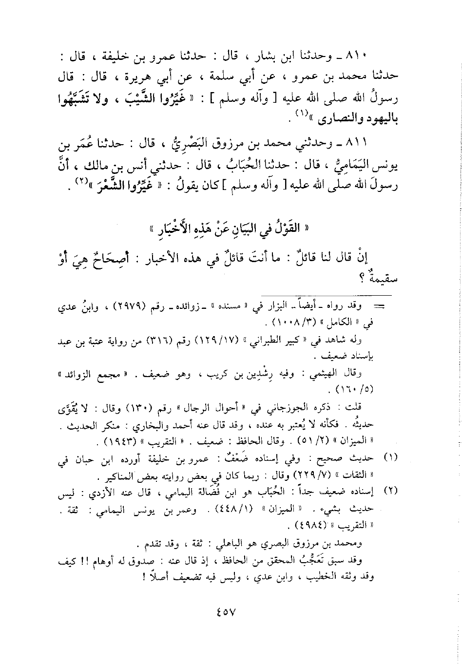 810 - وَحدثنَا ابْن بشار، قَالَ: حَدثنَا عَمْرو بن خَليفَة، قَالَ: حَدثنَا مُحَمَّد بن عَمْرو، عَن أبي سَلمَة، عَن أبي هُرَيْرَة، قَالَ: قَالَ رَسُول الله - صَلَّى اللَّهُ عَلَيْهِ وَسَلَّم َ -: " غيروا الشيب، وَلَا تشبهوا باليهود وَالنَّصَارَى ".