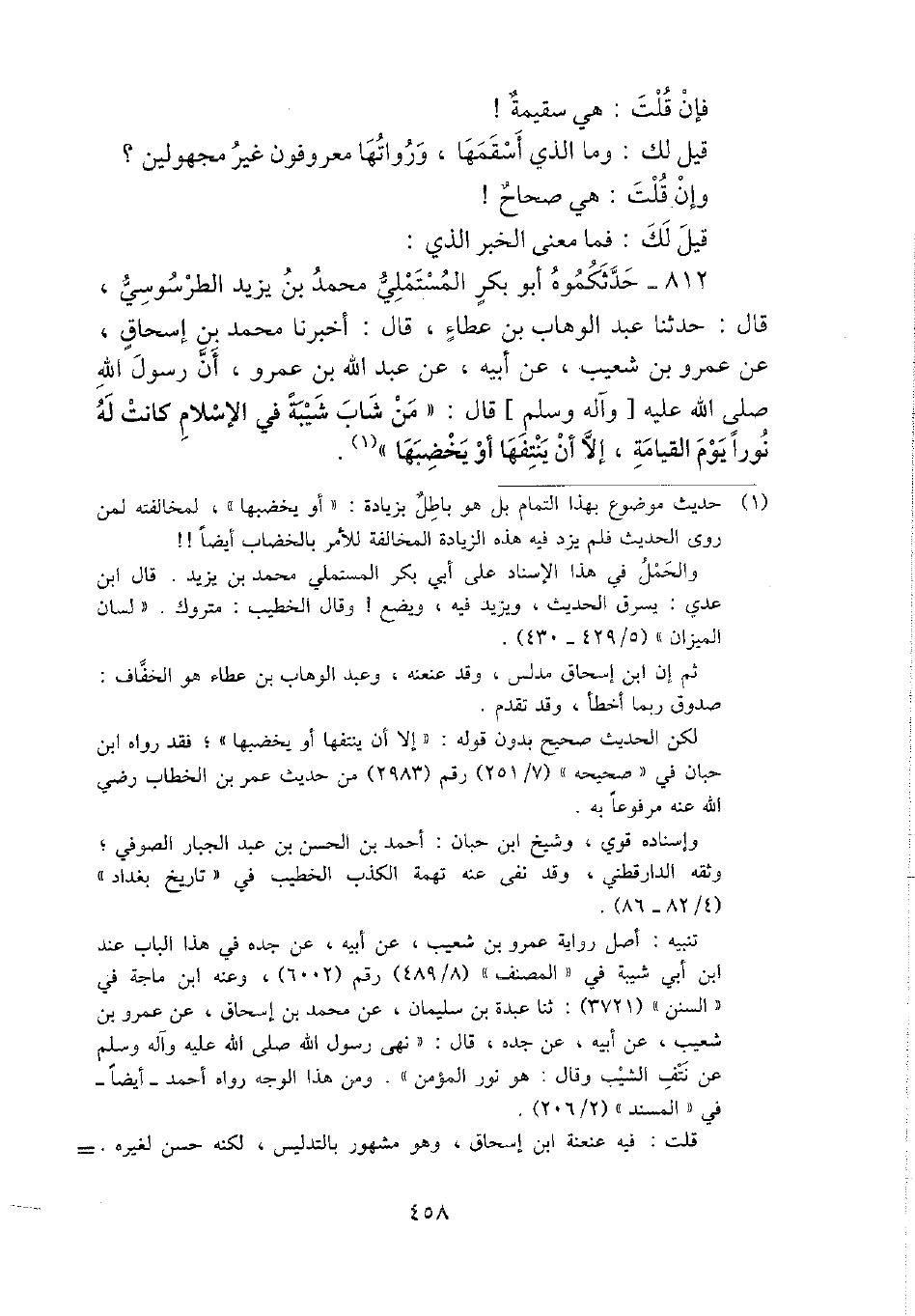 812 - حدثكموه أَبُو بكر الْمُسْتَمْلِي مُحَمَّد بن يزِيد الطرسوسي، قَالَ: حَدثنَا عبد الْوَهَّاب بن عَطاء، قَالَ: أخبرنَا مُحَمَّد بن إِسْحَاق، عَن عَمْرو بن شُعَيْب، عَن أَبِيه، عَن عبد الله بن عَمْرو، أَن رَسُول الله - صَلَّى اللَّهُ عَلَيْهِ وَسَلَّم َ - قَالَ: " من شَاب شيبَة فِي الْإِسْلَام كَانَت لَهُ نورا يَوْم الْقِيَامَة، إِلَّا أَن ينتفها أَو يخضبها ".