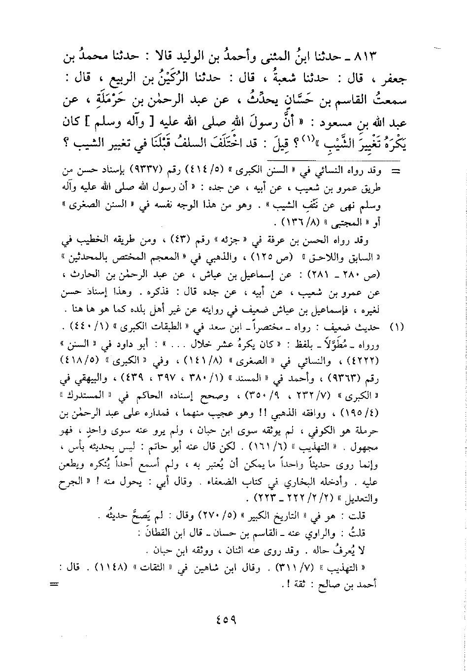 813 - حَدثنَا ابْن الْمثنى وَأحمد بن الْوَلِيد قَالَا: حَدثنَا مُحَمَّد بن جَعْفَر، قَالَ: حَدثنَا شُعْبَة، قَالَ: حَدثنَا الركين بن الرّبيع، قَالَ: سَمِعت الْقَاسِم بن حسان يحدث، عَن عبد الرَّحْمَن بن حَرْمَلَة، عَن عبد الله بن مَسْعُود: " أَن رَسُول الله - صَلَّى اللَّهُ عَلَيْهِ وَسَلَّم َ - كَانَ يكره تَغْيِير الشيب "؟ قيل: قد اخْتلف السّلف قبلنَا فِي تَغْيِير الشيب؟