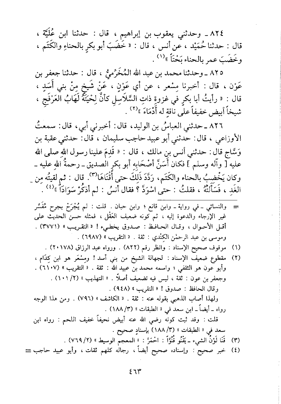 824 - وحَدثني يَعْقُوب بن إِبْرَاهِيم، قَالَ: حَدثنَا ابْن علية، قَالَ: حَدثنَا حميد، عَن أنس، قَالَ: " خضب أَبُو بكر بِالْحِنَّاءِ والكتم، وخضب عمر بِالْحِنَّاءِ بحتا ".