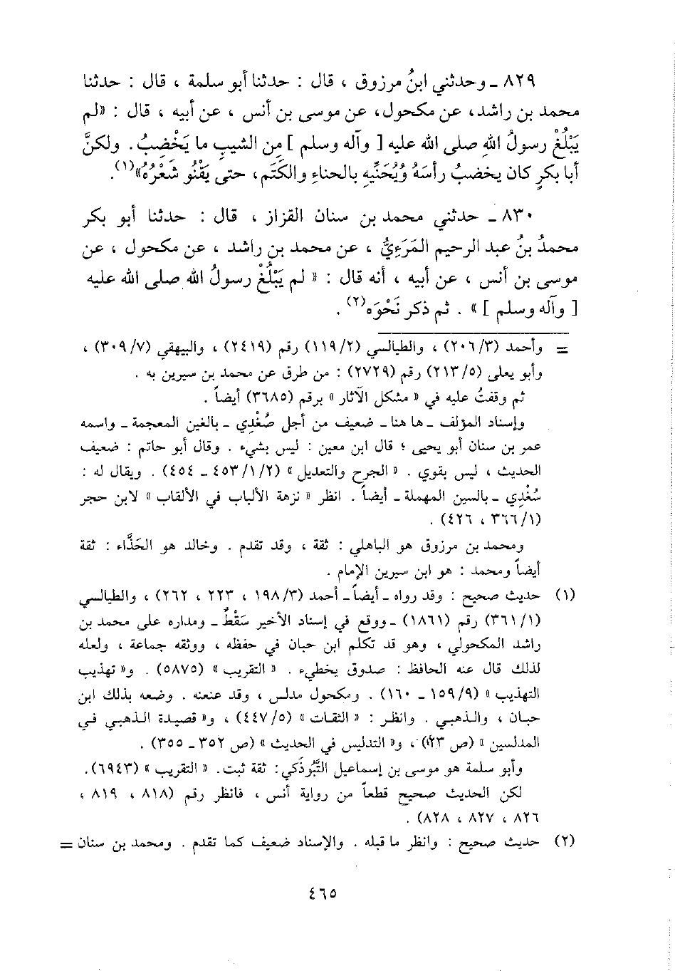 829 - وحَدثني ابْن مَرْزُوق، قَالَ: حَدثنَا أَبُو سَلمَة، قَالَ: حَدثنَا مُحَمَّد بن رَاشد، عَن مَكْحُول، عَن مُوسَى بن أنس، عَن أَبِيه، قَالَ: " لم يبلغ رَسُول الله - صَلَّى اللَّهُ عَلَيْهِ وَسَلَّم َ - من الشيب مَا يخضب. وَلَكِن أَبَا بكر كَانَ يخضب رَأسه ويحنيه بِالْحِنَّاءِ والكتم، حَتَّى يقنو شعره ".