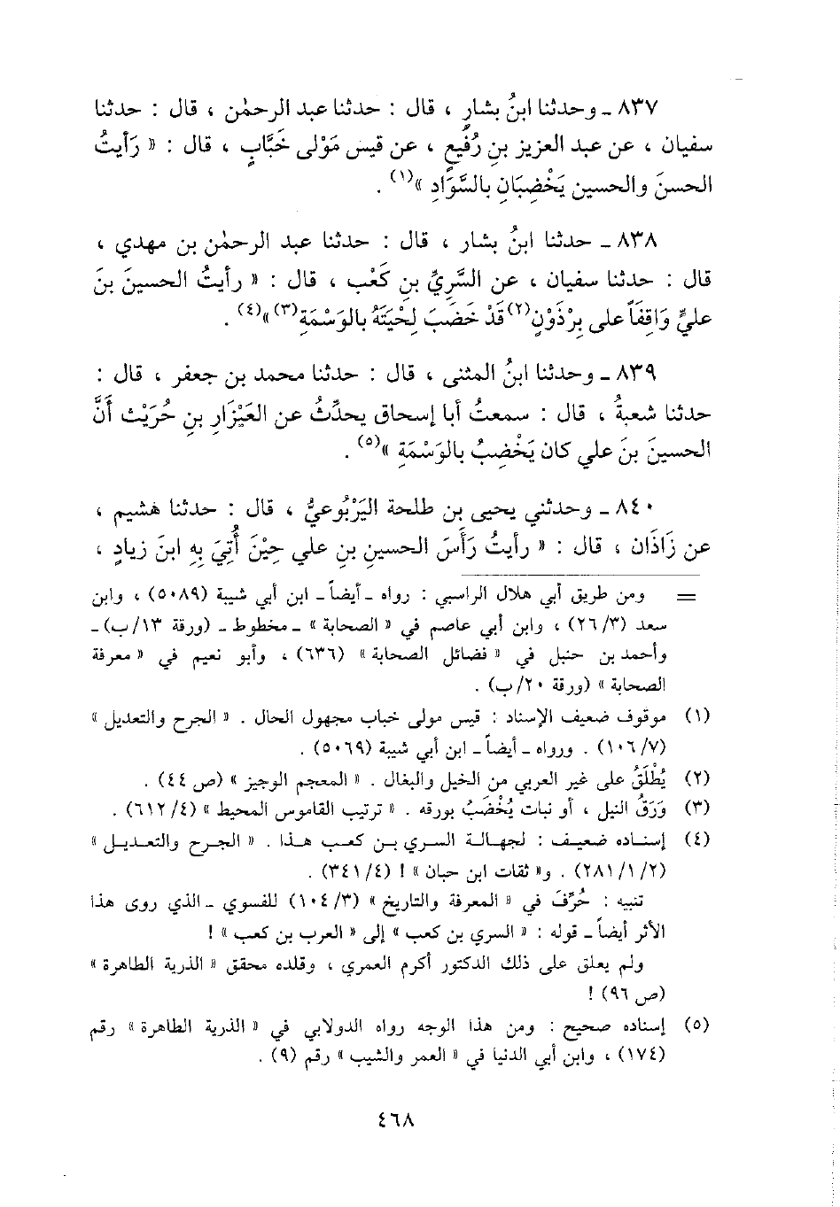 838 - حَدثنَا ابْن بشار، قَالَ: حَدثنَا عبد الرَّحْمَن بن مهْدي، قَالَ: حَدثنَا سُفْيَان، عَن السّري بن كَعْب، قَالَ: " رَأَيْت الْحُسَيْن بن عَليّ وَاقِفًا على برذون قد خضب لحيته بالوسمة ".