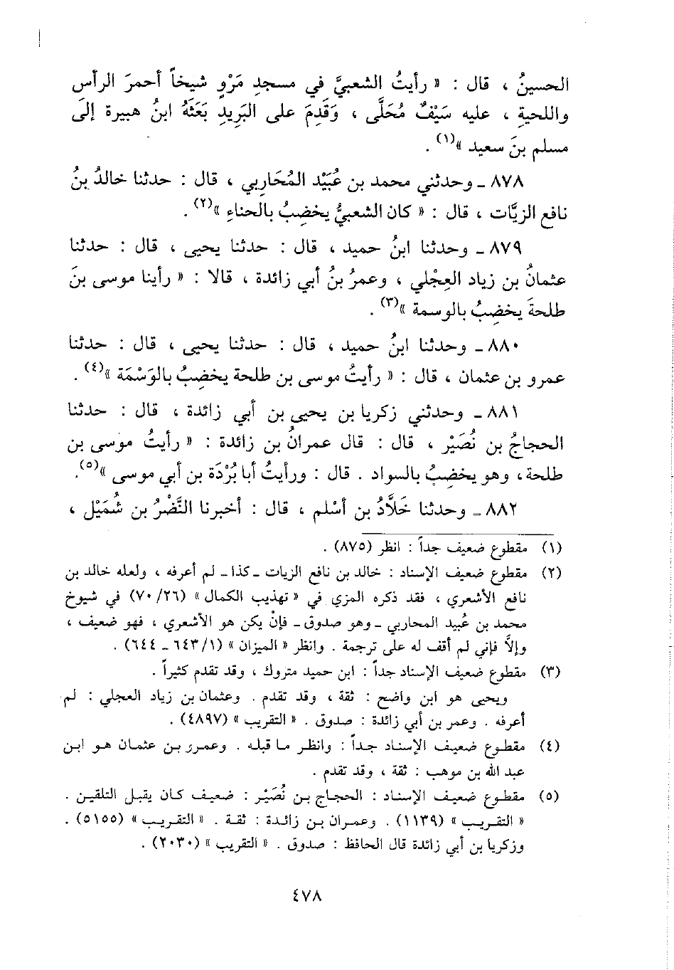 881 - وحَدثني زَكَرِيَّا بن يحيى بن أبي زَائِدَة، قَالَ: حَدثنَا الْحجَّاج بن نصير، قَالَ: قَالَ عمرَان بن زَائِدَة: " رَأَيْت مُوسَى بن طَلْحَة، وَهُوَ يخضب بِالسَّوَادِ. قَالَ: وَرَأَيْت أَبَا بردة بن أبي مُوسَى ".