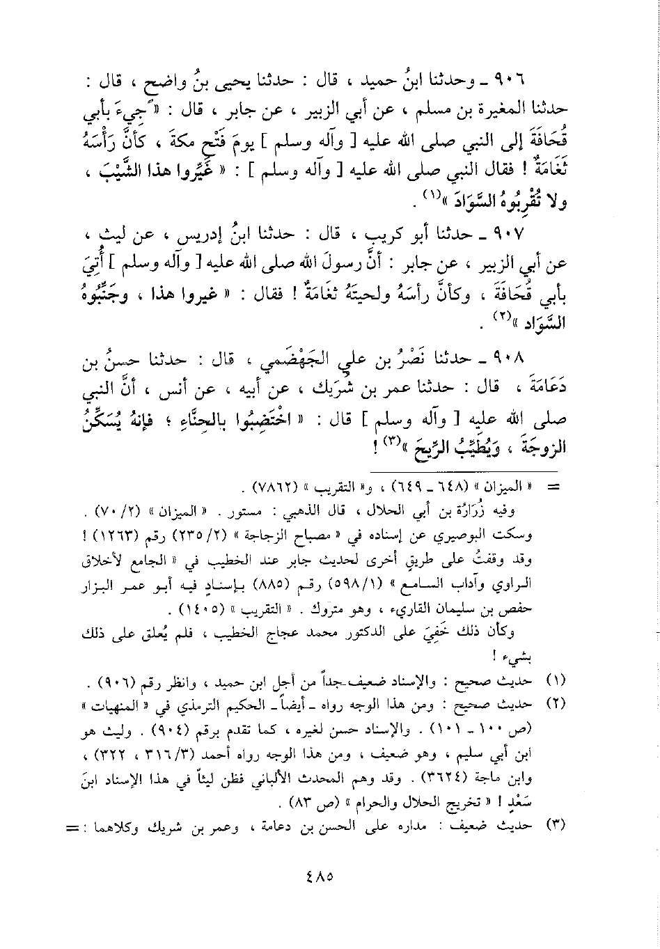906 - وَحدثنَا ابْن حميد، قَالَ: حَدثنَا يحيى بن وَاضح، قَالَ: حَدثنَا الْمُغيرَة بن مُسلم، عَن أبي الزبير، عَن جَابر، قَالَ: " جِيءَ بِأبي قُحَافَة إِلَى النَّبِي - صَلَّى اللَّهُ عَلَيْهِ وَسَلَّم َ - يَوْم فتح مَكَّة، كَأَن رَأسه ثغامة {فَقَالَ النَّبِي - صَلَّى اللَّهُ عَلَيْهِ وَسَلَّم َ -: " غيروا هَذَا الشيب، وَلَا تقربوه السوَاد ".
