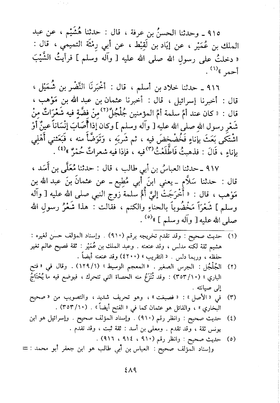 917 - حَدثنَا الْعَبَّاس بن أبي طَالب، قَالَ: حَدثنَا مُعلى بن أَسد، قَالَ: حَدثنَا سَلام - يَعْنِي ابْن أبي مُطِيع - عَن عُثْمَان بن عبد الله بن موهب، قَالَ: " أخرجت إِلَيّ أم سَلمَة زوج النَّبِي - صَلَّى اللَّهُ عَلَيْهِ وَسَلَّم َ - شعرًا مخضوبا بِالْحِنَّاءِ والكتم، فَقَالَت: هَذَا شعر رَسُول الله - صَلَّى اللَّهُ عَلَيْهِ وَسَلَّم َ - ".