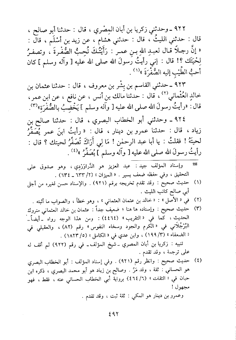 924 - وحَدثني أَبُو الْخطاب الْبَصْرِيّ، قَالَ: حَدثنَا صَالح بن زِيَاد، قَالَ: حَدثنَا عَمْرو بن دِينَار، قَالَ: " رَأَيْت ابْن عمر يصفر لحيته} فَقلت: يَا أَبَا عبد الرَّحْمَن! مَا لي أَرَاك تصفر لحيتك؟ قَالَ: رَأَيْت رَسُول الله - صَلَّى اللَّهُ عَلَيْهِ وَسَلَّم َ - يصفر ".