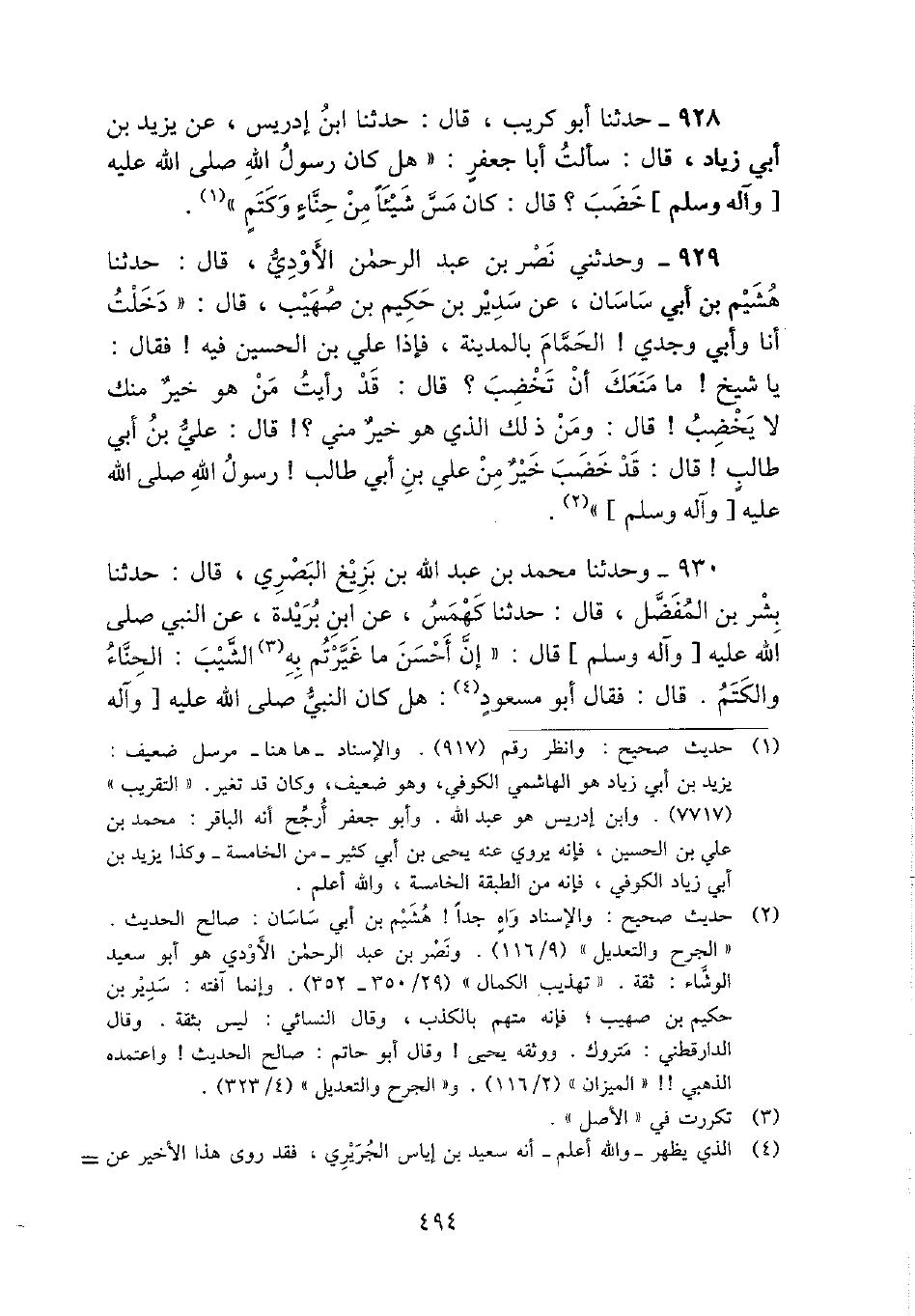929 - وحَدثني نصر بن عبد الرَّحْمَن الأودي، قَالَ: حَدثنَا هشيم بن أبي ساسان، عَن سدير بن حَكِيم، بن صُهَيْب، قَالَ: " دخلت أَنا وَأبي وجدي {الْحمام بِالْمَدِينَةِ، فَإِذا عَليّ بن الْحُسَيْن فِيهِ} فَقَالَ: يَا شيخ {مَا مَنعك أَن تخضب؟ قَالَ: قد رَأَيْت من هُوَ خير مِنْك لَا يخضب} قَالَ: وَمن ذَلِك الَّذِي هُوَ خير مني؟ {قَالَ: عَليّ بن أبي طَالب} قَالَ: قد خضب خير من عَليّ بن أبي طَالب! رَسُول الله - صَلَّى اللَّهُ عَلَيْهِ وَسَلَّم َ - "
