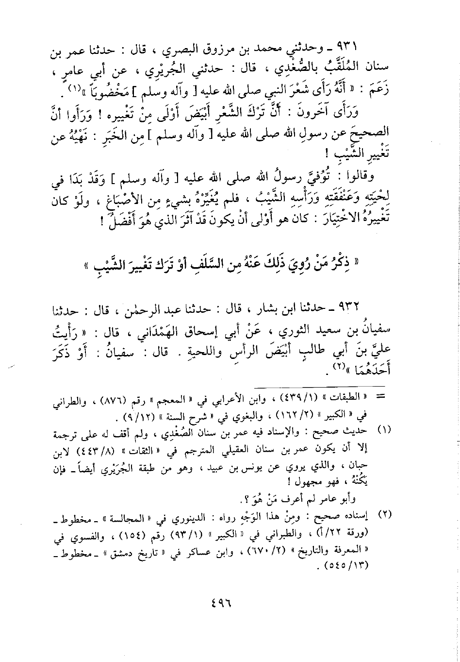 931 - وحَدثني مُحَمَّد بن مَرْزُوق الْبَصْرِيّ، قَالَ: حَدثنَا عمر بن سِنَان الملقب بالصغدي، قَالَ: حَدثنِي الْجريرِي، عَن أبي عَامر، زعم: " أَنه رأى شعر النَّبِي - صَلَّى اللَّهُ عَلَيْهِ وَسَلَّم َ - مخضوبا ".