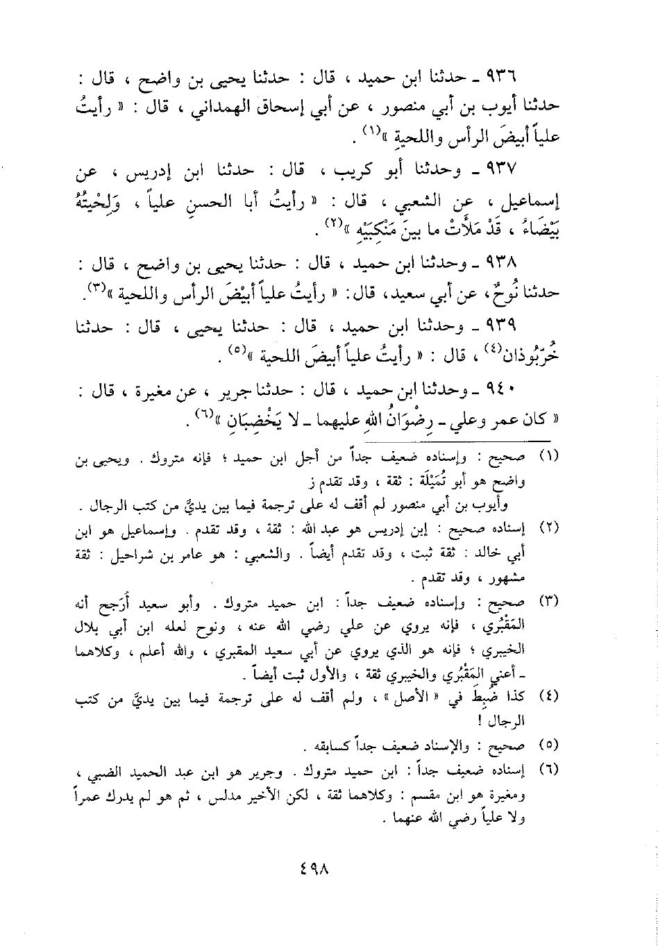 936 - حَدثنَا ابْن حميد، قَالَ: حَدثنَا يحيى بن وَاضح، قَالَ: حَدثنَا أَيُّوب بن أبي مَنْصُور، عَن أبي إِسْحَاق الْهَمدَانِي، قَالَ: " رَأَيْت عليا أَبيض الرَّأْس واللحية ".