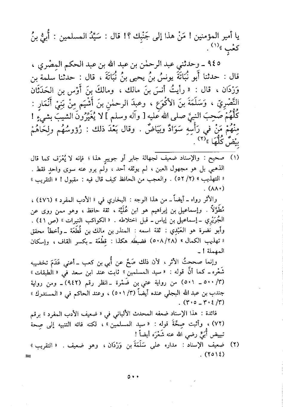 يَا أَمِير الْمُؤمنِينَ {من هَذَا إِلَى جَنْبك؟} قَالَ: سيد الْمُسلمين: أبي بن كَعْب ".
